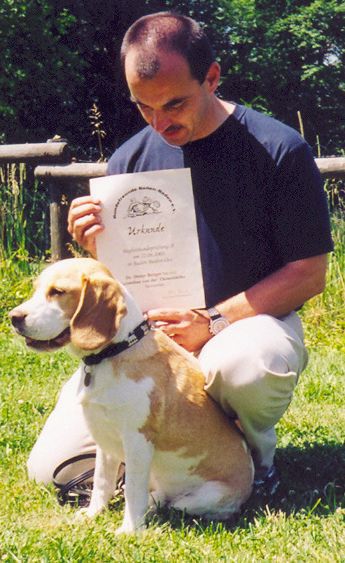 Mit seinem Beagle Maxi absolvierte Dieter Berger am 22.06.2003 bei den Hundefreunden Baden - Baden die Begleithundeprüfung als Bester (55 von 60 möglichen Punkten). Insgesamt teilgenommen haben 11 Teams, wovon 3 die Prüfung nicht bestanden haben. Und daß gerade der Beagle unter den verschiedenen Hunderassen vorne lag, ist besonders beeindruckend.