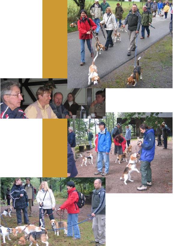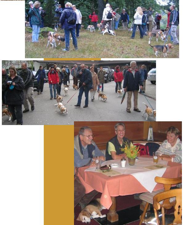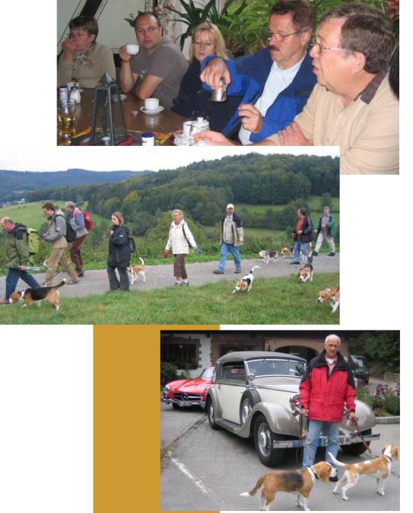 Der Anreisetag, Freitag, 30.9.2005, war ein Tag bundesrepublikanischer Verkehrs-Chaos-Normalität, so dass wir selbst – trotz früher Abreise - erst gegen Abend eintreffen konnten. Familie Kirn wird deshalb von den Aktivitäten dieses Tages gesondert berichten. Für uns alle beginnt der Samstag (1.10.2005) mit nieselnder Anfahrt zur „Tromm“, den „Aussichtsturm“ konnten wir nur im Hochnebel erahnen, aber Beagles und Beagler lassen sich von derartigen Widrigkeiten nicht beirren, sondern wandern mehr oder weniger fröhlich schließlich durchnässt bis auf die Haut zum „Schardhof“, einem bis zu diesem Zeitpunkt besucherlosen Ausflugslokal, wo wir liebevoll aufgenommen und versorgt werden, obwohl wir deutliche Pfützen auf den Fliesen unter uns verbreiten. Nach der Rückkehr im Hotel ist intensive Trocknung angesagt. Das Hauptmenü der Halbpensionsverpflegung mundet trefflich, auch und gerade wegen der „Spülflüssigkeiten“. Eine andere Art der Spülung schüttet derweil draußen über Stunden wie aus Kübeln. Nur nicht daran denken, wenn wir morgen durch diese Wassermassen waten müssen. Vom Hoch „Oldenburgia“ konnten wir noch nichts ahnen, seine ersten Vorboten müssen aber zumindest den Regen vertrieben haben, als wir am Sonntag, 2.10.2005, vorm Hotel 23 Mitglieder der HeSü-Landesgruppe mit ihrem Vorsitzendem, Herrn Wilfried Heckmann, mitsamt weiteren 17 Beagle begrüßen dürfen. Trocken-fröhlich nehmen wir erneut die Anfahrt zum Parkplatz auf der Tromm in Angriff. Jetzt marschieren wir in anderer Richtung zum Sonnen-Cafe „Kreidacher Höhe“. Wie das obligatorische Gruppenbild vermuten lässt, ist es jetzt trocken und licht, die Menschen-Mienen verraten die Zufriedenheit des gestillten Hungers, die Gesichtsausdrücke der dargestellten Beagles lassen sich nicht so leicht in der einen oder anderen Richtung deuten. Weiterhin ist das Hotel mit Parkplatz Treffpunkt von Mercedes-Oldtimern und ihren Besitzern. Auch das lässt nostalgische Gedanken aufhellend um Augen und Mundwinkel spielen.Der Wanderwart weist den Weg zurück zum Hotel, die Schirme können geschlossen bleiben.
