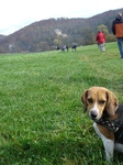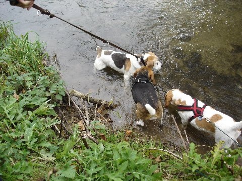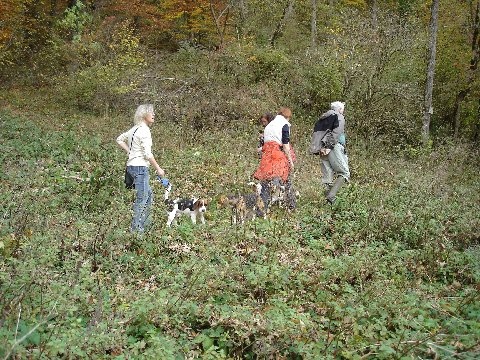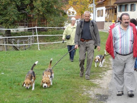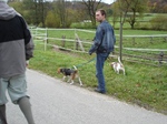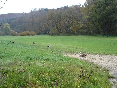 Beagles sofort die Zuschauertribüne erkundeten (vielleicht haben die Zuschauer etwa Essbares liegengelassen). Danach führte uns der Weg durch ein kleines Waldstück, wo einige Beagles sich auf eine
