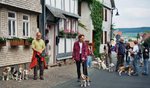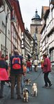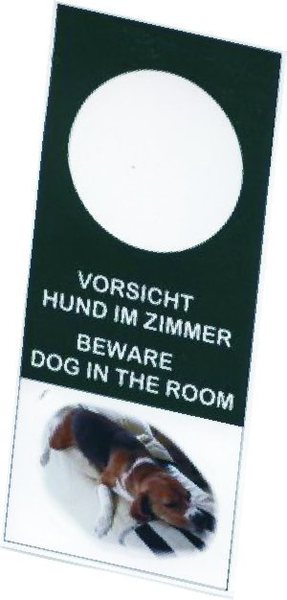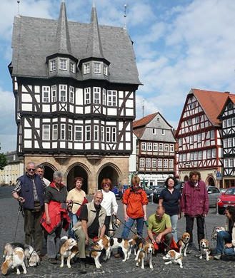 22.05.08 - Pünktlich morgens um 10.00 Uhr trafen sich 15 gutgelaunte Beagler, 14 Beagles und 1 Labrador-Retriever-Hündin auf dem Parkplatz des Hotels. Gernot überreichte jedem Teilnehmer ein Dossier mit akribisch ausgearbeitetem Überblick des Wochenendes, genau detailliert beschriebenen Anfahrten, die außerdem noch fotografisch in Form von Ortsschildern abgebildet waren. In der Heftleiste allerdings klemmte der Clou - ein von ihm angefertigterHoteltüranhänger mit Lotta-Nelda auf der Lehne des Sofas im Wohnzimmer abgebildet - HUND IM ZIMMER - (s. Foto).Gernot hieß uns alle herzlich willkommen, Conny Maier-Franke begrüßte uns im Namen der Landesgruppe. Das erste Gruppenfoto wurde geschossen und auf ging`s zum ersten Spaziergang von Eudorf in die europäische Modellstadt Alsfeld, erstmals urkundlich erwähnt im Jahre 1069, mit ihrer gut erhaltenen Altstadt, romantischen Gässchen, jeder Menge historischer Bauten. Wir marschierten in Alsfeld ein und unsere kleine geschlossene Beaglemeute erregte natürlich Aufsehen. Auf dem Weg zum Marktplatz wurde sich allgemein eine Eistüte gegönnt aber, was wahre Hundeliebe ist, bewies Birgit Kahle.Sie kam mit drei Eis zurück, eines davon mit Vanille für die Hunde, die dann der Reihe nach ein Löffelchen bekamen. Vorne weg war unsere kleine Josie die sich, um nicht übersehen zu werden, kerzengerade auf ihre Hinterbeine stellte. Beschwingt ging es nach dieser kleinen Sightseeing-Tour durch schöne grüne Wiesen zurück zum Hotel.Pünktlich um 19.00 Uhr fanden wir uns in dem extra für uns reservierten gemütlichen Raum zu einem sehr guten Halbpensionsmenue und einem ersten Glas Wein ein. Für die Bedienung sollte diese Weinbestellung allerdings eine Herausforderung werden, denn Inge Behlert wollte einen Rotwein, keinen halbtrockenen, einen aus der Region, aber keinen Dornfelder, denn der könnte ja halbtrocken sein und durch die vielen gutgemeinten Tips war sie so hin- und hergerissen, dass es dann kein deutscher und auch kein ausländischer ( ! ) sein sollte, zum großen Gelächter der Anwesenden. Es wurde dann doch ein Dornfelder, ein guter trockener.