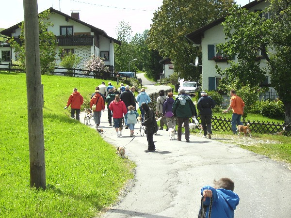 Bis zum frühen Nachmittag des Fronleichnamtages am 11.6. hatten sich 30 Beagler einschließlich einiger Tagesgäste aus der unmittelbaren Umgebung mit insgesamt 28 Hunden, um bei gemäßigten Temperaturen die unmittelbare Umgebung mit dem Ortsteil Mittelberg zu erkunden. Die beiden Nicht-Beagles waren ja schon lange in das Rudel partnerschaftlich aufgenommen worden, so dass es keine Probleme bereitete, die ebenen meist asphaltierten Wege zu bewältigen.