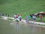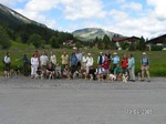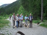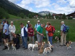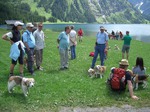 Solcherart vortrainiert fuhren wir am Samstag nach Tannheim in Österreich im Konvoi der Autos, was aber schon auf einige Schwierigkeiten stieß. In Tannheim war der verabredete Parkplatz „P2“ seitens der Gemeinde so schlecht ausgeschildert, dass erst mit Verzögerung von fast einer Stunde der letzte Teilnehmer das Feld gefunden hatte. Obwohl sicher jeder Beagler über ein Handy verfügte, war aber eine Kommunikation nicht möglich, da die bekannten Nummern entweder nicht eingeschaltet waren oder im Hotel ruhten. Wegen der schattenarmen Wegstrecke bei fast 25 Grad bekamen einige ältere Beagle und Führer Kreislaufprobleme, die im „Ernstfall“ wegen der Kommunikationsmängel zu Problemen der Versorgung geführt hätten. Als Lösungsmöglichkeit wurden für die Zukunft Teilnehmerlisten mit den Mobilfunknummern verabredet. Ausgedehnte Stärkung war in der Almhütte möglich, wegen des großen Andrangs der Wanderer mussten jedoch längere Schlangen und Wartezeiten in Kauf genommen werden. Auch der Wanderführer mit Beagle wurde im Auto eines Teilnehmers zum Parkplatz transportiert.