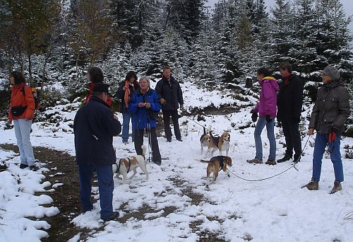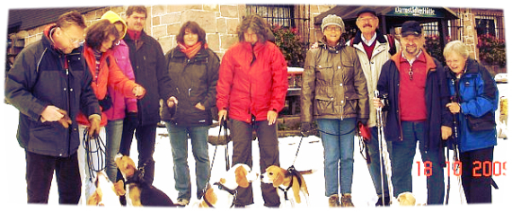meiner Extratour zurück. Es folgten weitere Anstiege auf 1020 m bis zur ehemaligen Falzhütte. Hier gab es eine Überraschung für uns Beagles und die hieß: S C H N E E. Ausgiebig konnten wir toben und