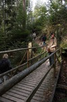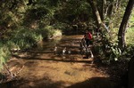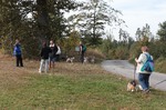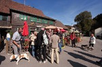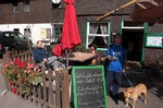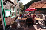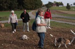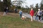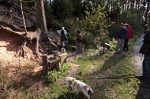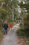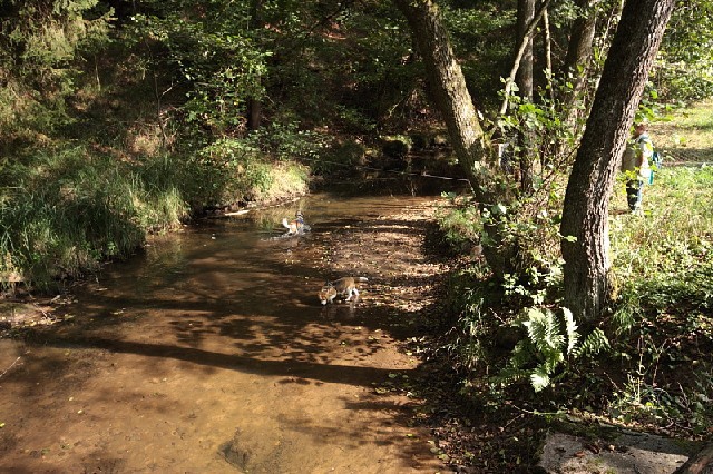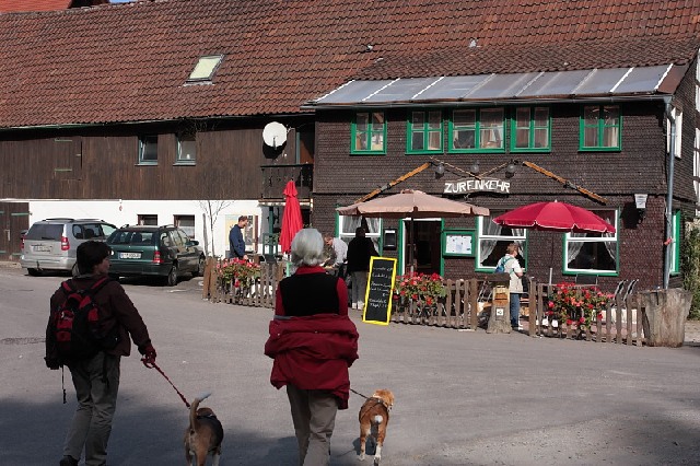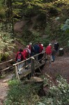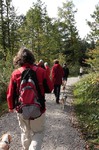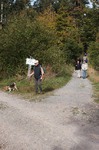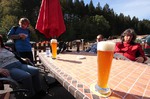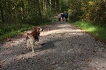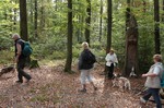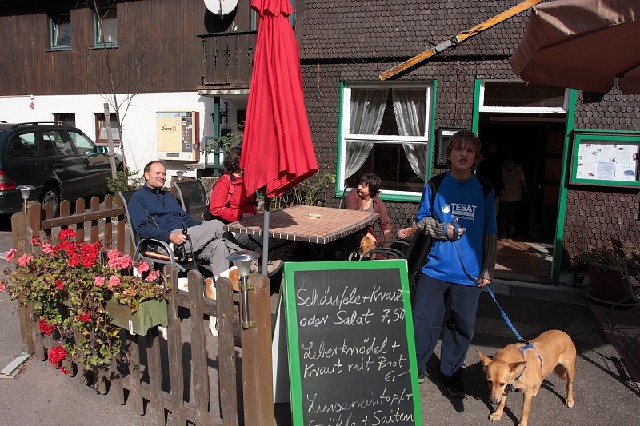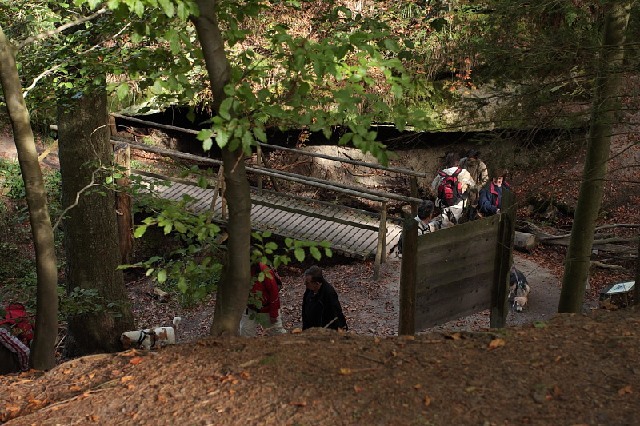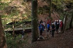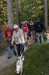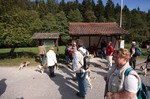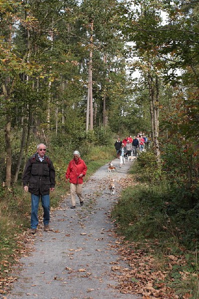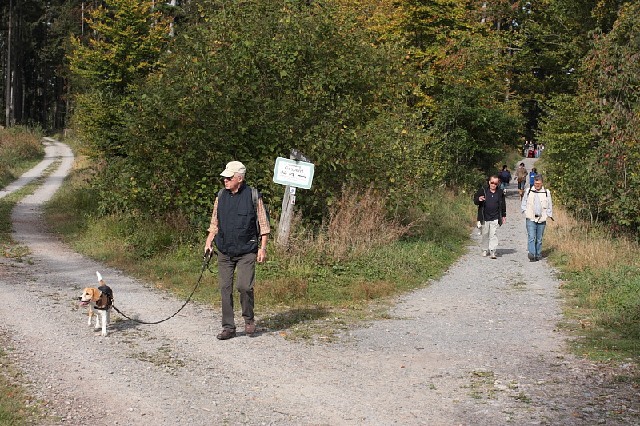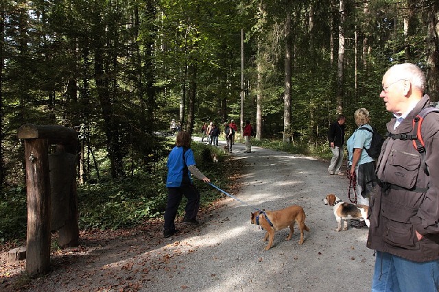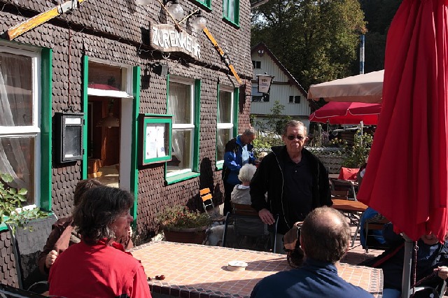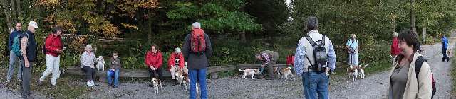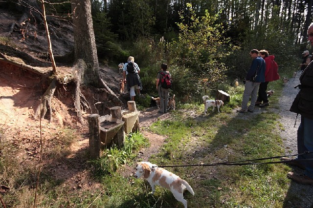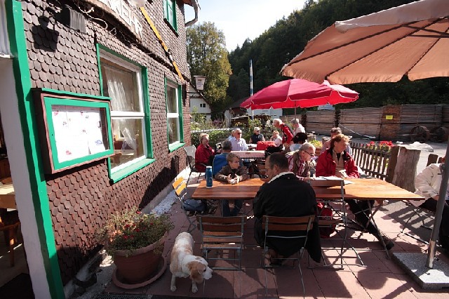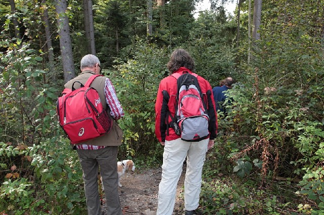 Am Samstag, den 03.10. trafen sich 18 Personen wieder vor dem Hotel. Durch das Dorf ging es in Richtung Wald in das Rottal. Wir wanderten auf dem Fuxi-Pfad (Pfad der Sinne) durch leuchtend bunte Mischwälder. Nach den ca. ersten 7 km erreichten wir das Örtchen Rösselsmühle. Im Ausflugslokal "Zur Einkehr" fanden wir alle Platz im Vorgarten, das Vesperangebot war reichhaltig und wir schwärmen heute noch von dem Schwäbischen Apfelkuchen - fantastisch! Mensch und Hund entspannten sich in der Sonne und wir hätten noch lange gesessen, wenn Dieter Stephan nicht zum Aufbruch geblasen hätte. Dieses Mal erregte Lester`s Aufmerksamkeit das baumelnde Hündchen an Wolfgang Schöberl`s Rucksack. Nach weiteren 7 km kamen wir gegen ca. 15.00 Uhr wieder in Mainhardt an. Um 18.30 Uhr trafen wir uns zum Abendessen und Renate Zeiss bedankte sich mit einem Präsent bei Waltraud Hasenlocher, die die Idee für dieses Wochende hatte und bei Dieter Stephan als Organisator, mit einem Bierpäsent (!!!). So ging ein lustiger Abend zuende und wir freuten uns auf die letzte Wanderung.