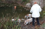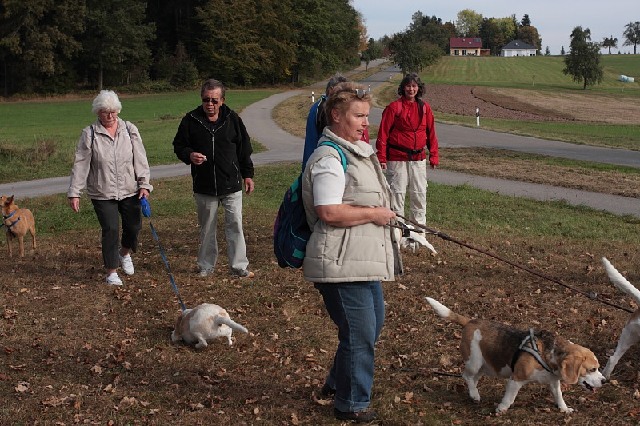 Am 02.10. trafen sich gegen 15.00 Uhr 9 Personen am Parkplatz und wir fuhren nach Geißenhardt zum Start der "Limes-Wanderung" - 7 km. In der Hoffnung, daß das Wetter für das Wochende so bleibt, starteten wir bei herrlichem Sonnenschein und unser Weg führte zuerst über Wiesen, vorbei an orangerot leuchtenden Kürbisfeldern. Es dauerte nicht lang, tauchte am Waldrand der erste Römerwachturm auf, den wir, unterstützt mit ausgiebiger Geschichtsinformation an den angebrachten Glastafeln besichtigten. Es ging weiter durch ausgedehnte Streuobstwiesen, die zwischenzeitlich Lester`s Frauchen anfingen, den letzten Nerv zu kosten, waren es Birnen, Zwetschen oder Walnüsse, alles wurde staubsaugermäßig im wahrsten Sinne des Wortes aufgesaugt und es zeichnete sich ein Wettlauf zwischen Lester und mir ab, möglichst das meiste Obst wieder aus dem Fang zu puhlen, denn auch vielen Wespen schmeckte es. Emely von Fam. Schröpfer entdeckte vor einem etwas verwunschenen sehr großen Anwesen einen Topf in der Hoffnung , etwas Fressbares gefunden zu haben und durch unsere kleine Meute aufmerksam geworden, erschienen in der Tür zwei Damen, die uns sehr freundlich begrüßten und für die Hunde gleich gießkannenweise Wasser anschleppten. Auf die Frage nach der Bestimmung des Gebäudes wurden wir spontan zur Besichtigung eingeladen und ein Teil des Hauses entpuppte sich als eine große Kunstgalerie. Eine der Damen war Künstlerin, die auf riesige Acryltafeln verschieden bunte Motive aufbrachte, die Häuserfassaden, Schornsteine oder U-Bahnwände verzieren. Außerordentlich beeindruckt bedankten wir uns für die Gastfreundschaft und die kleine Reise durch die Kunst. Auf dem weiteren Verlauf der Wanderung entdeckten wir in einem der herrlich blühenden Bauerngärten zwei große Blechkühe, die auf eine Käserei hinwiesen. Auf dem letzten Stück des Rückweges mußte sich Emely noch schnell in einem Weiher abkühlen, witzig der Anblick eines mit Wasserlinsen dick bedeckten Teiches und inmitten nur sichtbar ein Beaglekopf. Etwas schwieriger gestaltete sich der Landgang, denn das dichte Brombeergestrüpp mußte an die Seite und das gab so manchen blutigen Finger. Aber alles ging gut und am Parkplatz wieder angekommen freuten wir uns auf einen gemütlichen Abend.