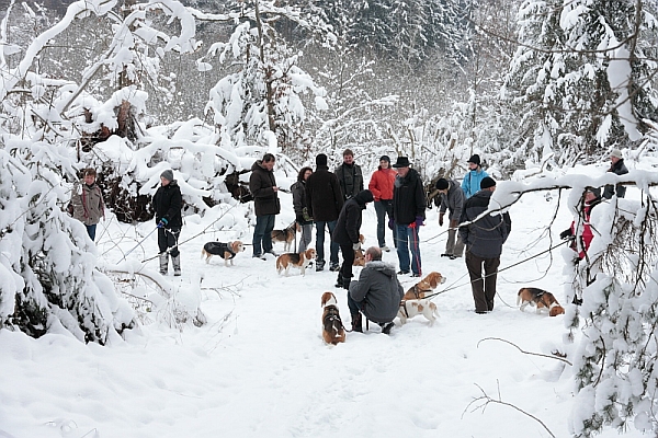 ist nun hinter uns, und wir stapfen durch die verschneiten Sulzbachtalwiesen. Viele Beagle können jetzt das Finale des Spazierganges vollends ohne Leine auskosten, bis wir das Hotel erreicht haben.