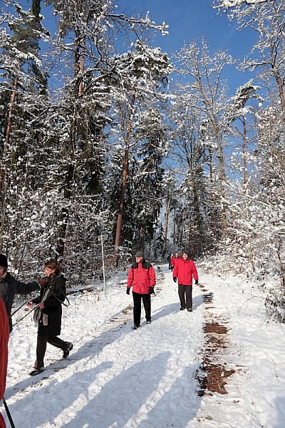 ansteigend, vom See weg, durch den Wald hinauf nach Steinenbronn. Verschneite Streuobstwiesen sind jetzt das Thema im Hintergrund der Steinenbronner Kirchturm. Ein schönes Bild. Es geht jetzt entlang