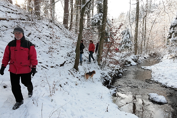 überqueren die Bundesstraße Schönaich / Steinenbronn. Vereint geht es weiter nach Süden durch verschneite Waldwege. Es geht immer leicht bergab und nach einer 3/4 Stunde haben wir das Rückhaltebecken