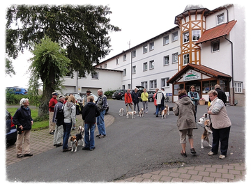 Nach mehrjährigen Gedankenspielen hatten wir im Hilderser Ortsteil Oberbernhards das Hotel "Milseburg" mit der Familie Stefan Storch ausfindig gemacht, das willens und in der Lage war, eine Gruppe unserer Größenordnung mit entsprechenden Beagle-Zahlen zu beherbergen.