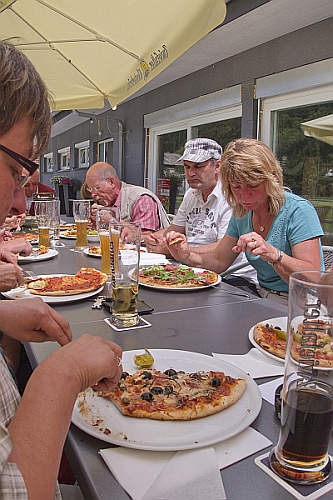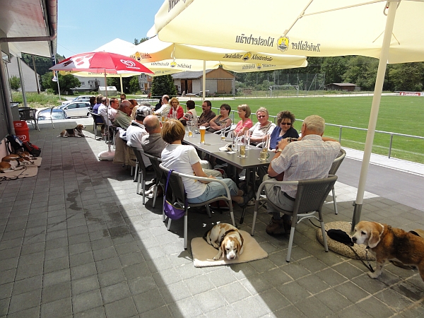 Stunden in Hettingen. Nach einem kleinen Umweg mangels Brücke über die Fehla sind wir dann glücklich im Sportlerheim in Hettingen gelandet. Dort stand eine einladende Terrasse zur Labung mit Speis