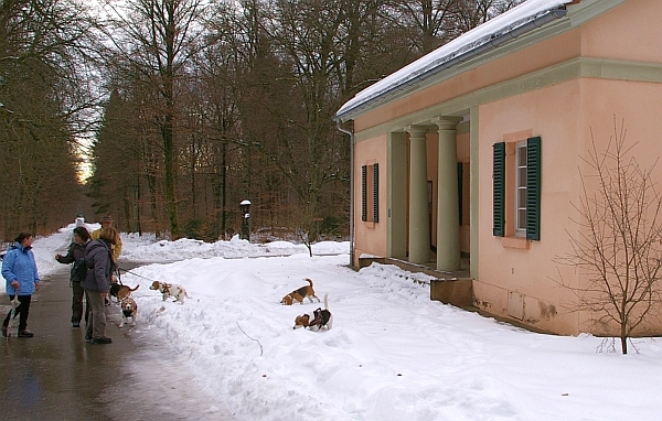 Der Beagletross setzte sich unter der Führung von Dieter Stephan, der diesen Spaziergang vorbereitet hatte, in Bewegung. Es ging in südlicher Richtung los unter der Stgt Strasse hindurch, um nach einigen Minuten auf die Bruderhausallee zu stoßen, die uns in bolzgerader Richtung, durch einen stark schneevereisten Trampelpfad, der uns weiterhin in südlicher Richtung voranbrachte. Es regnete nicht, und die Bodenverhältnisse wurden zusehens besser. Der Schnee wurde immer weicher, und somit auch griffiger für unsere Fußsohlen. Irgendwann bogen wir nach links ab, und erreichten nach einiger Zeit den Bärensee. Ein Stück am See entlang, und wir kamen auf das Bärensträßle, das uns in nördlicher Richtung wieder zurück über die Wildparkstrasse am Schloss Solitude vorbei, nach ca. 2 1/2 Stunden, auf unseren Parkplatz brachte. Die Zeit war schon fortgeschritten, so dass wir uns beeilen mussten, ins Lokal zu kommen. Es verrann die Zeit bei gutem Essen, und heiteren Gesprächen.
