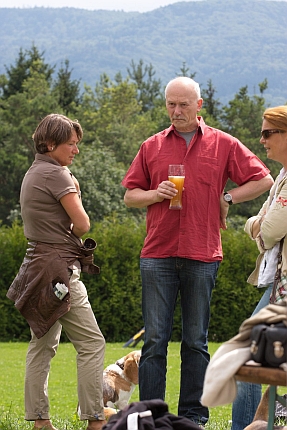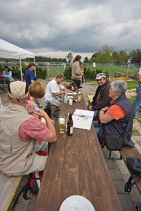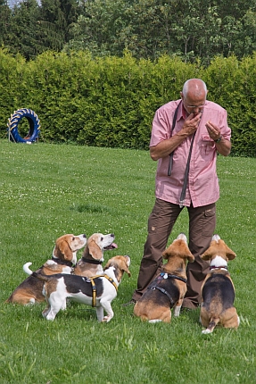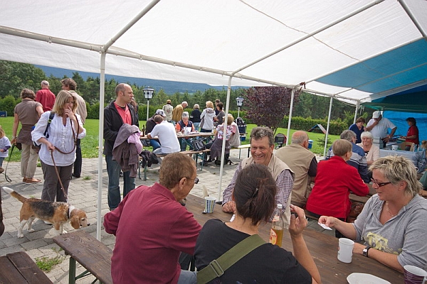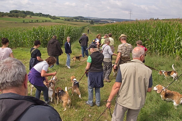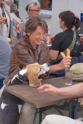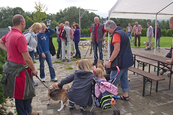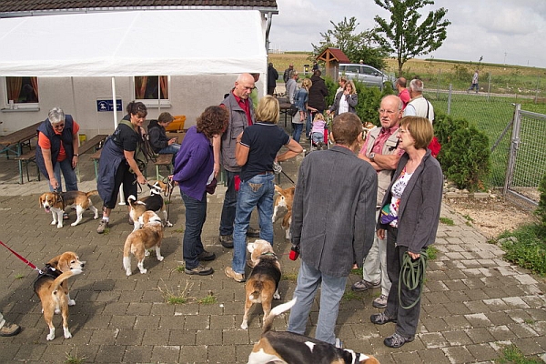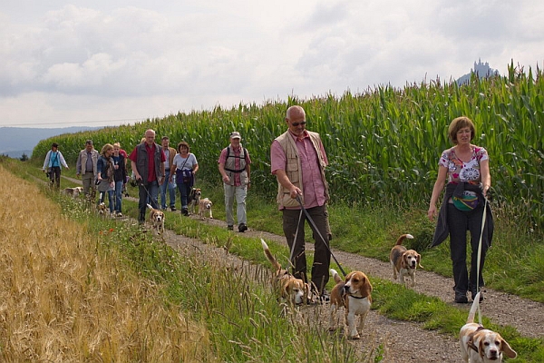 Beim diesjährigen Sommerfest war die Teilnehmerliste sehr lang geworden. Unsere 1. Vorsitzende Renate Zeiss konnte ca. 60 Beagleleute auf dem Hundesportgelände des HSV Thanheim in Bisingen begrüßen. Bisingen liegt zwischen Balingen und Hechingen. Die Hohenzollernburg ist hier allgegenwärtig, und lenkt das Auge in ihren Bann. Auch unseren Wolfsburger Beaglern war der Weg in den Süden nicht zu weit. Zur Begrüßung gab es Butterbrezeln mit Kaffee. Der HSV Thanheim organisierte für uns einen ca. 1,5-stündigen Spaziergang durch die Felder. Nach unserer Rückkehr vom Spaziergang wurden wir auf hervorragende Weise von den Thanheimer Hundesportlern bewirtet. Es gab Gutes vom Grill. Später Kaffee und Kuchen. Unsere zahlreichen Beagles durften nach Herzenslust auf dem eingezäunten Gelände miteinander toben, Verfolgungsjagd spielen, Unrat suchen, oder auch mal die Nase in die Vereinsküche stecken. Wie im Flug verann die Zeit. Ein Bierchen im Stehen. Ein Schwätzchen mit Freunden. Mit den Beagles auf dem Gelände toben. Im Gras liegen usw….Renate Zeiss verteilte wie jedes Jahr noch Würstchen an jeden Beagle, was natürlich der absolute Hype für unsere Hunde darstellte.