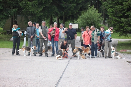 So traf denn am Donnerstag, dem 21.6.2012, eine durchaus heterogene Gruppe von 23 Beaglern mit Gästen sowie 12 Beagle sowie 5 Gasthunden vom ruhigen Labrador über liebenswerten Wolfshund-Dackel-Mix bis zum quirligen Yorkshire-Terrier am Zielort ein. Heterogen im Hinblick auf die Heimatorte bis Hamburg, das Alter zwischen 75 und 5 Jahren, Großeltern bis Enkel und Wanderkompetenz von Dolomiten- bis Asphalterfahrung. Der Dauerregen der Tage zuvor hatte rechtzeitig geendet, so dass wir in Ruhe unter kühlem Sonnenhimmel das bekannte Café Lenkgrund mit seinem Kuchensortiment ansteuern konnten. Die Abende gestalteten sich in der gastfreundlichen Atmosphäre des Hotels gesellig-lebendig, auch die jeweiligen Spiele der Fußball-EM wurden per Fernsehgerät integriert.