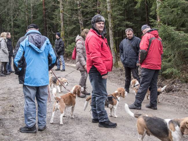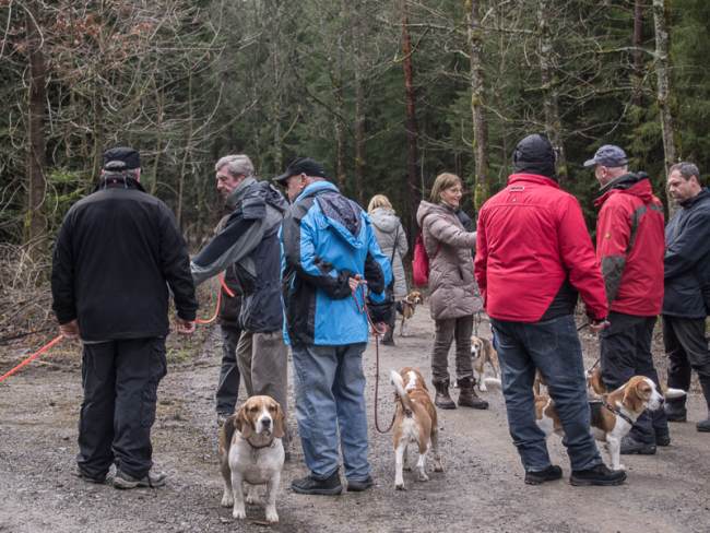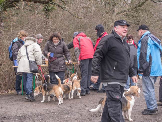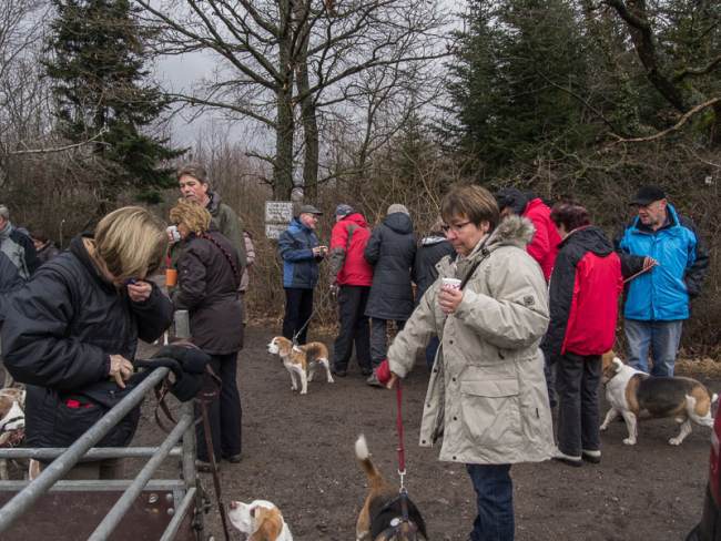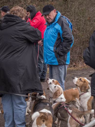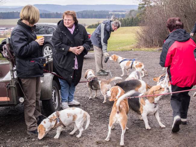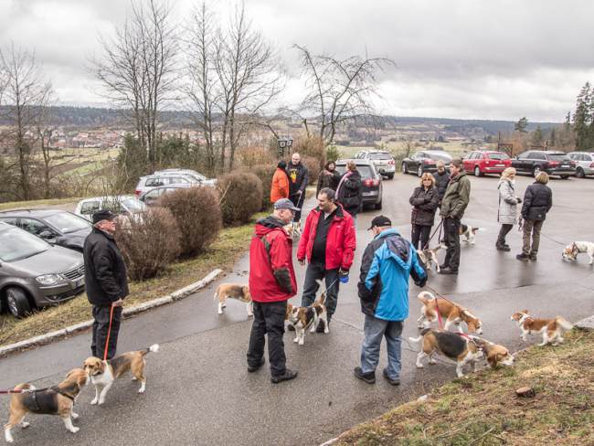 27 Aktivisten mit ihren 20 Beagles durchstreiften am 02.Februar 2013, die Fluren bei Geislingen im Hohenzollernkreis. Vom Treffpunkt Schützenhaus