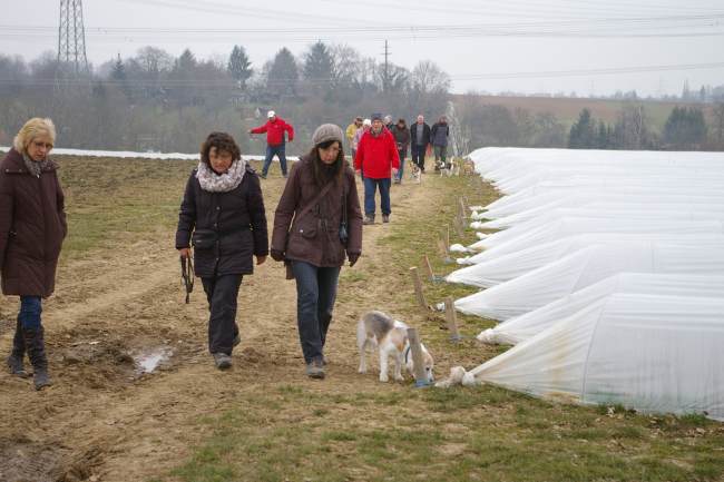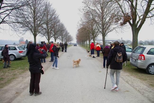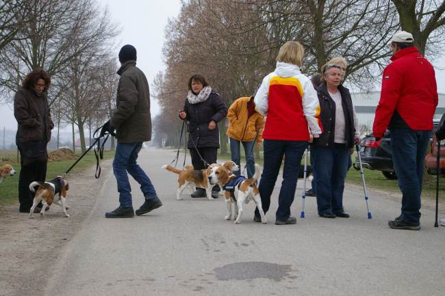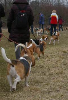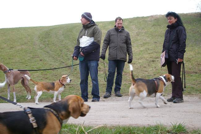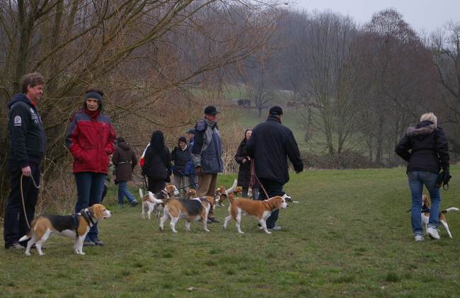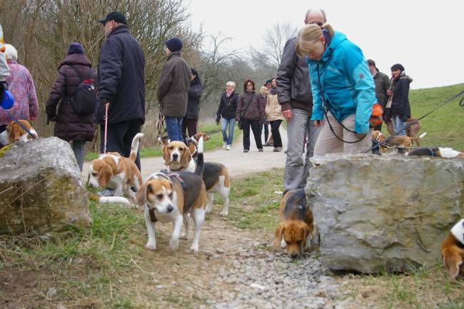 Ca. 35 Wanderer und Freunde der LG Baden-Württemberg folgten der Einladung von Waltraud Hagenlocher und Manuela Pahl zur Beaglewanderung am 6. April 2013. Wir trafen uns um 10:00 Uhr auf dem Parkplatz vom Sonnenhof in Stgt. Mühlhausen und wanderten in östlicher Richtung. Wir machten eine Kehre und drehten in westlicher Richtung dem Holzbach entlang. Ein sehr schönes Tal, an dem eine Beaglehündin von unserer Meute auch gleich sehr großen Gefallen gefunden hatte. Man hörte sie überall, und es dauerte eine gewisse Zeit, bis wir sie wieder in unseren Reihen begrüßen durften. Wir stiegen aus dem romantischen Tal empor auf eine sehr schöne Heidelandschaft nahe dem Flugplatz Pattonville. Hier ließ sich erahnen, daß der Hasenbesatz sehr hoch sein musste. Deshalb galt die Aufmerksamkeit um so mehr unseren Beagles. Zurück ging es wieder hinunter ins Tal entlang am Bach. Unsere Beagles hatten riesen Spaß sich auf den Bachwiesen auzutoben, bis wir wieder die Anhöhe zum Sonnenhof erreichten.