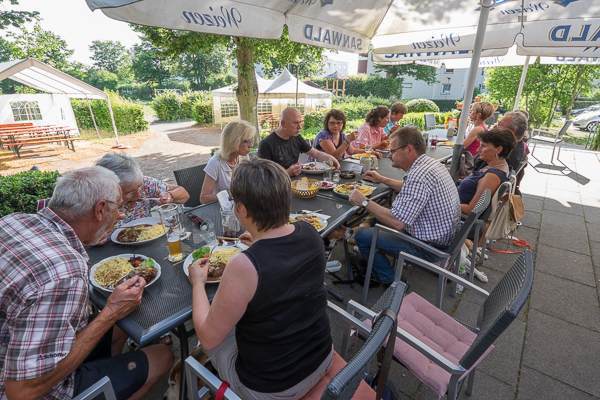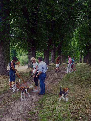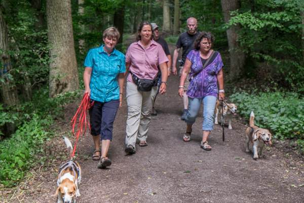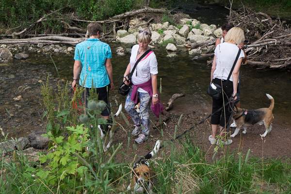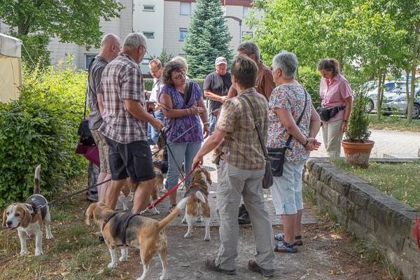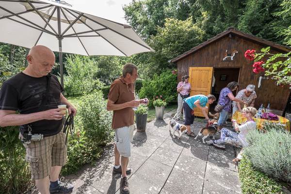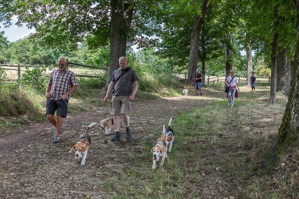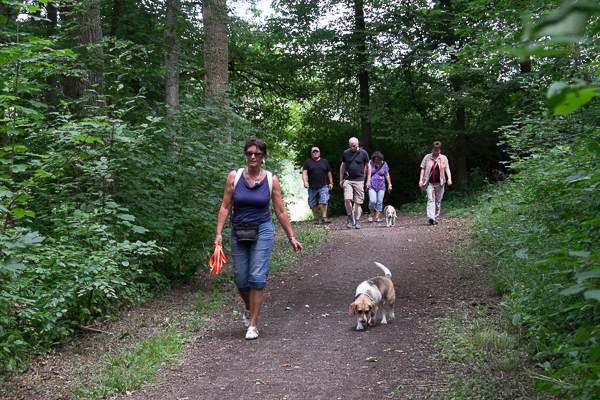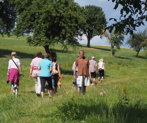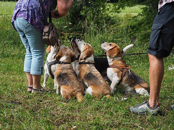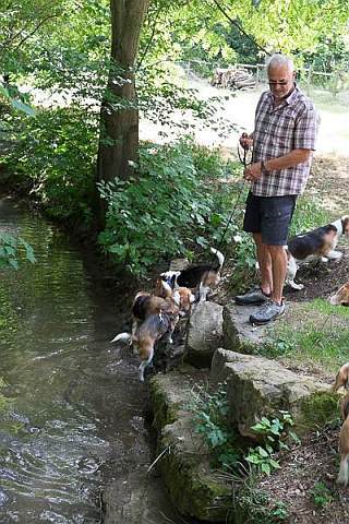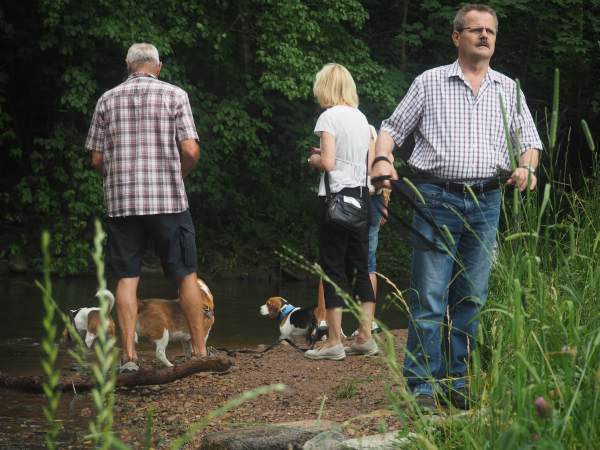 Conny und Rolf Maier mit Q-bee und Diamond luden am Sonntag den 06.Juni 2014 zu einem sehr sommerlichen Beaglespaziergang ein. Das Wetter war bestens. Wir starteten um 14:30 Uhr am Waldheim in Ruit. Es ging in Richtung Süden, über die Höfelbachstrasse, wir tangierten den Scharnhausener Park und kamen zur Unteren Kastanienallee, deren wir folgten und kurz vor Scharnhausen die K1269 überquerten. Nun ging es über steil ansteigende Wiesenwege in Richtung Westen. Die Sonne brannte jetzt regelrecht, und es war gut , daß der Weg sich im Wald verlief. Aus dem Wald heraus, konnten wir Kemnat sehen. Über Wiesen, wieder in den Wald ging es weiter bis zum Zusammenfluß von Körsch und Ramsbach. Der Himmel hatte sich verdunkelt, und es gab ein paar Tropfen Regen. Unsere Beagles konnten nun an einer geeigneten Wasserstelle nach Herzenslust Baden und Trinken. Es war gerade recht, daß es nicht mehr weit zum Garten von Fam. Maier war. Vorbei am Stuttgarter Polizei-Pferdegestüt, über schöne Obstbaumwiesen, kamen wir in einen schattenspendenden Wald, der dann an einer Gartenkolonie endete. Einer wohlverdienten Pause für Mensch und Hund in Maiers Garten, konnte nichts mehr im Wege stehen. Kalte Getränke, Süssigkeiten etc. und für die Beagles ein Planschbecken und viel Wasser zum Durst löschen. Die Beagles nutzten den geräumigen Garten für ihr typisches Verfolgungsjagd-Spiel kreuz und quer. Es war nun Zeit aufzubrechen, damit wir um 17:30 Uhr im Waldheim Ruit ankamen, um dort unseren Abschluß mit Abendessen zu machen.