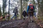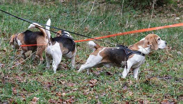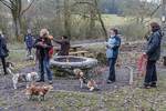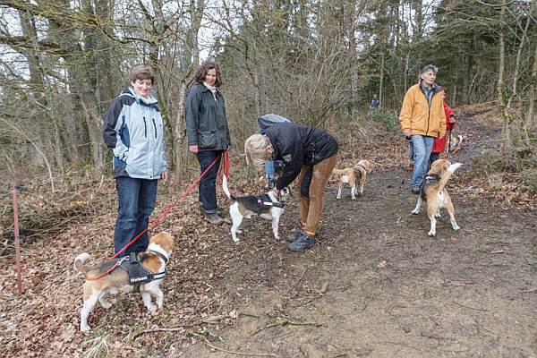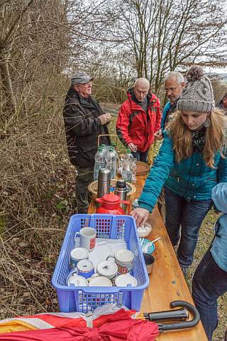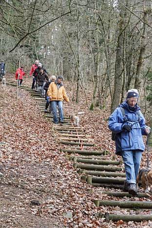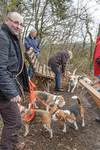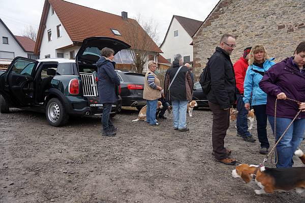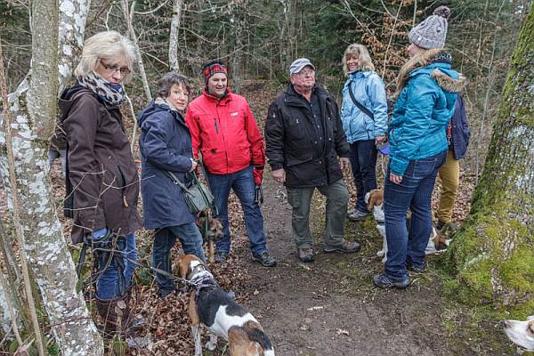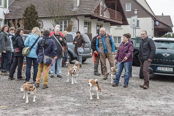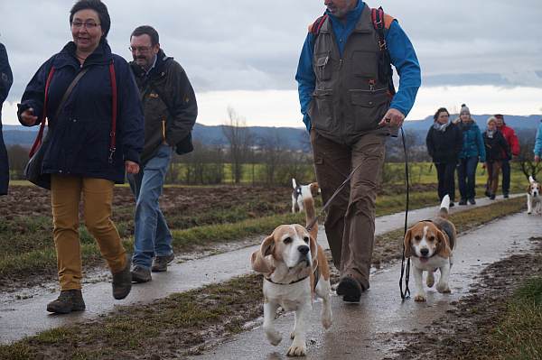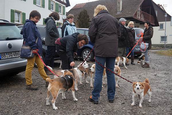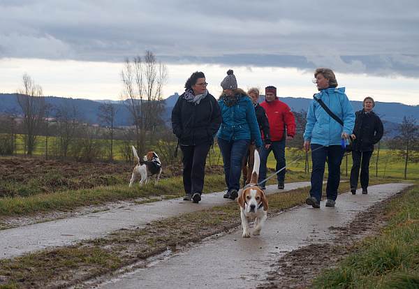 Nahezu 30 Beagler mit Hunden folgten der Einladung von Fam. Schneider am 15.02.2014 zur Beaglewanderung nach Gruol. Beim Gasthaus Hirsch traf man sich, und es ging auch gleich los in nördlicher Richtung unter der B463 hindurch, mit Blick auf Haigerloch, die Burg Hohenzollern im Rücken. Wir kamen in ein wunderschön romantisches Tal. Langsam gings nun bergauf durch den Wald, bis wir am jüdischen Friedhof vorbeikamen. Nach kurzer Pause weiter. Am Bergtrauf hatten wir einen ausgiebigen Blick nach Süden über Gruol, Burg Hohenzollern und die Schwäbische Alb. Ein herrlicher Platz zum verweilen. Nun vom Trauf hinunter ins Tal. Ein interessanter Wandersteig mit vielen Stufen. Als wir unten angekommen waren, wurden wir mit Kaffee und Wegzehrung belohnt. Die schon fast obligatorische Edelbrandverkostung war ein Hochgenuss für alle Freunde dieses Themas. Das Wetter wurde langsam ungemütlicher, so daß wir doch ziemlich schnellen Schrittes wieder nach Gruol zurückkamen, um im Gasthaus Hirsch in angenehmer Atmosphäre unser wohlverdientes Essen einzunehmen.