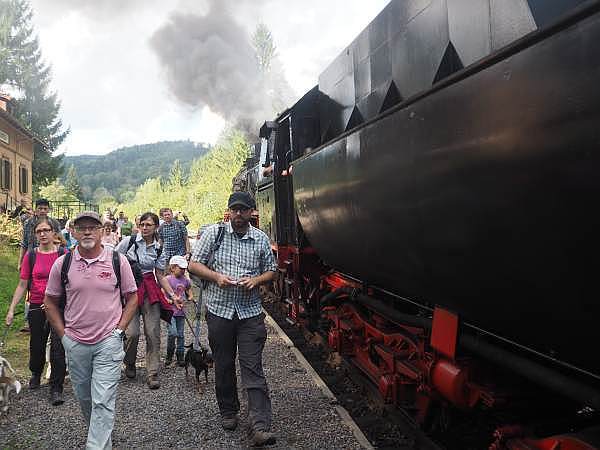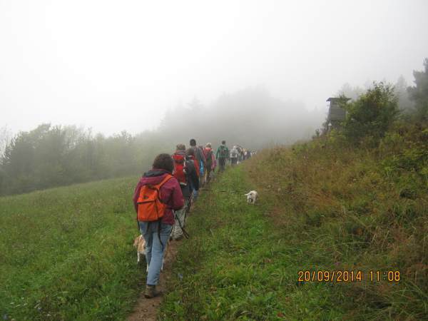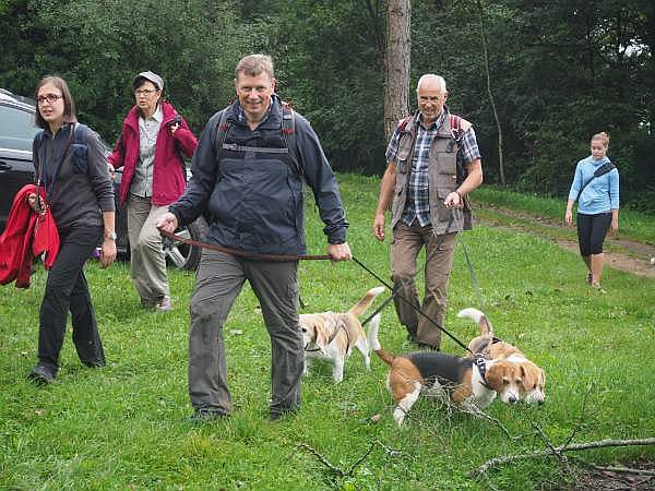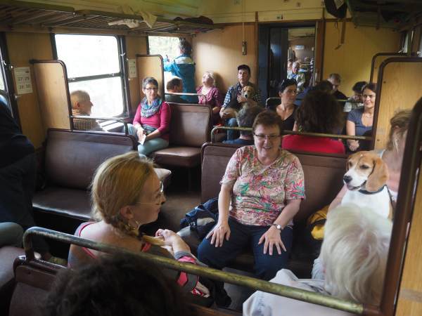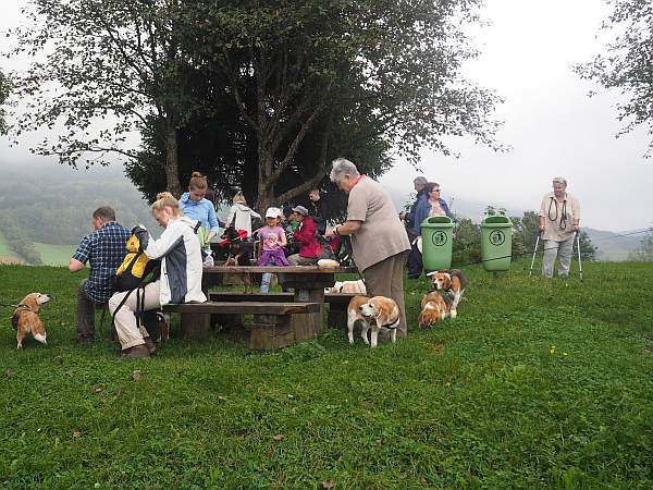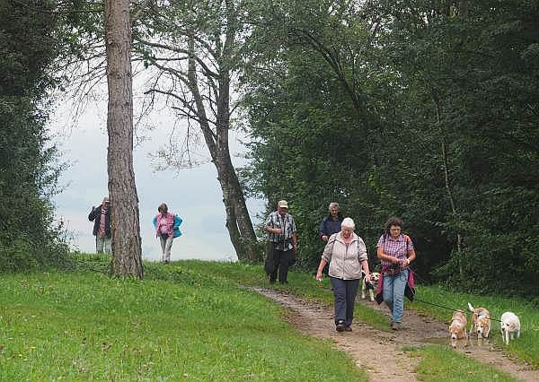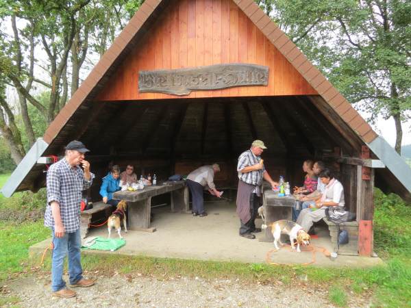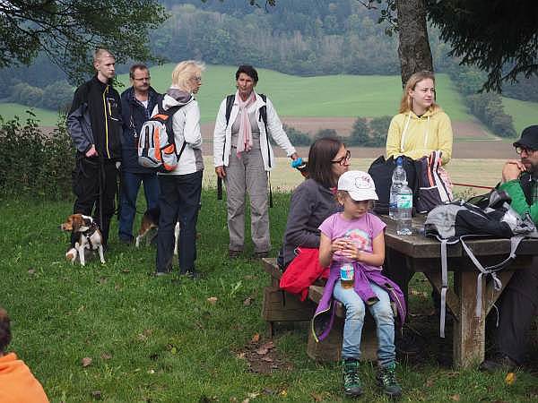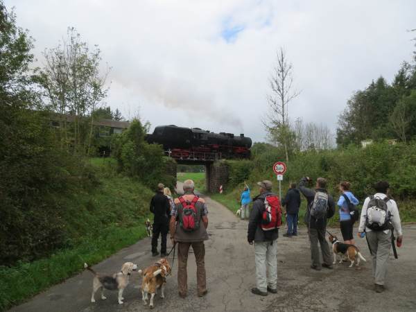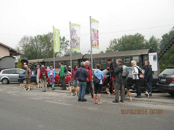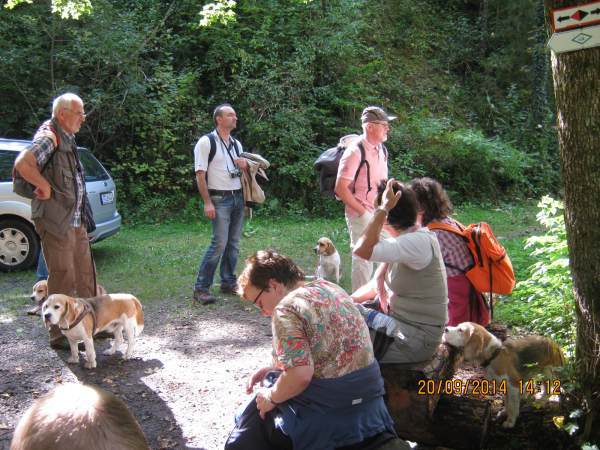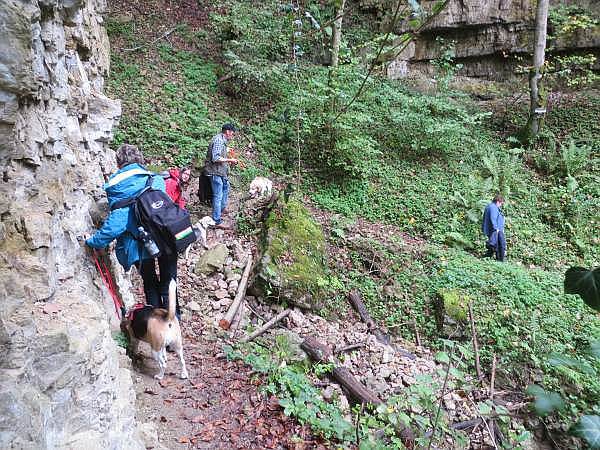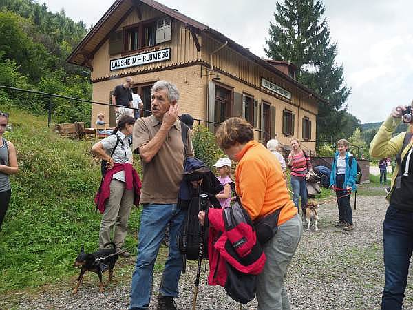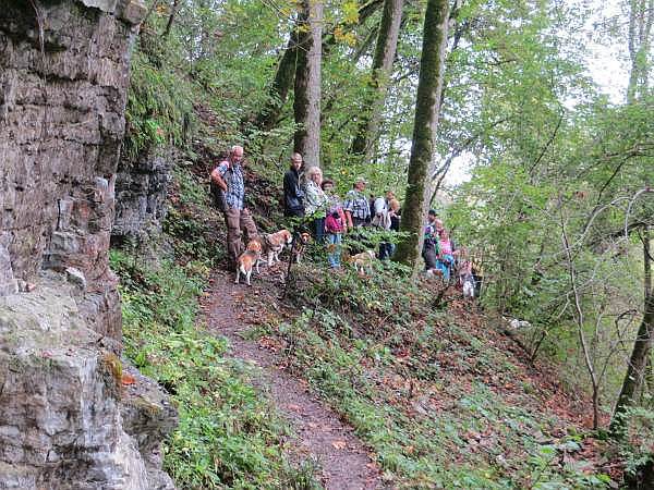 Um überhaupt mit der Sauschwänzlebahn zurückfahren zu können, mussten wir vom Bahnhof Blumberg-Zollhaus in Richtung Süden wandern. Nach ungefähr 6 km kamen wir am Grillplatz Bühl bei Fützen an, um eine Pause einzulegen. Nun ging es hinunter zur Wutach. Der Weg wurde anspruchsvoller und verwandelte sich in einen schmalen Wanderpfad, der gutes Schuhwerk und gute Trittsicherheit erforderte. Für diese schwierige Wegetappe, die durch Feuchtigkeit zu einer glatten, schmierigen Angelegenheit wurde, konnte man sich nur gut erzogene Beagles leisten, die verständnisvoll, ohne jegliches Ziehen an der Leine, diese Herausforderung mit ihren Frauchen und Herrchen zu meistern wussten. Die Teilnehmer waren begeistert. So waren weitere 8 km absolviert, und wir erreichten die Gaststätte Wutachschlucht, beim nahegelegenen Bahnhof Lausheim-Blumegg. Nach einer Stunde Kaffeetrinken traten wir die schon erwähnte Rückfahrt an.