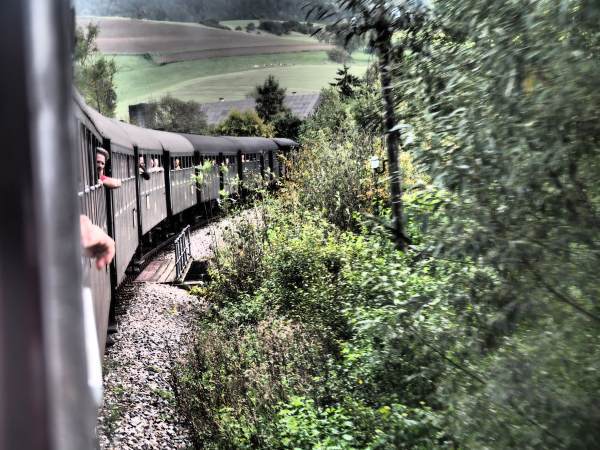 Abrupt wurde es wieder dunkel. Wir fuhren gerade in den zweiten Tunnel ein. Lautes Pfeifen der Dampflok machte uns hellwach. Viel Spaß hatten wir mit dem nostalgischen Dampfzug, der uns zurück nach Blumberg über Viadukte, durch Kehrtunnels, an wunderschönen Dörfern vorbei, durch eine wunderbare Landschaft beförderte. Wir waren Passagiere der Sauschwänzlebahn.
