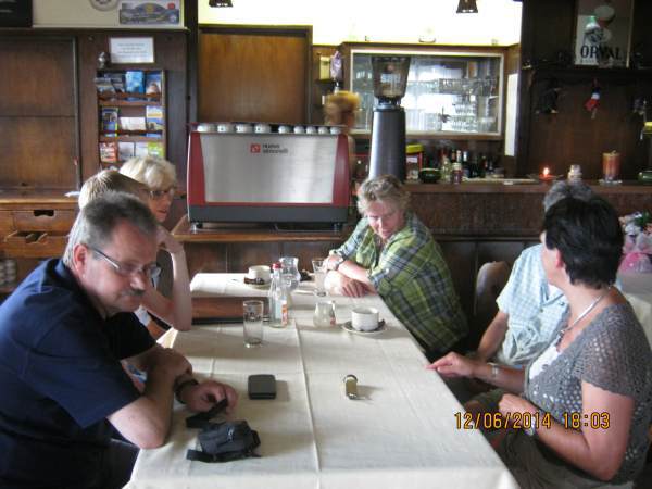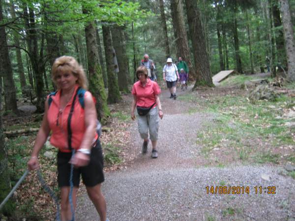 Für den Freitag (13. 6.) war ein historischer Rundgang entlang den deutsch-französischen Schlachtlinien aus dem ersten Weltkrieg geplant, die schon vom Hotel aus sichtbar ihre tiefgreifenden Spuren in der Hügellandschaft der "Ligne" (Landschaft oberhalb von Hohrodberg) hinterlassen haben. Wegen des notwendigen gnadenlosen Anstiegs von mehren hundert Metern Höhenunterschied über schattenloses Terrain bei sonnigen 30 Grad zur idyllischen Ferme Auberge Glasborn haben wir diesen Programmpunkt auf unbestimmte Zeit verschoben. Statt dessen wählten wir nach kurzer Anfahrt den schattigen und ebenen Weg vom deutschen Soldatenfriedhof zum "Croix de Wihr", einer Gedenkstätte für gefallene französische Soldaten. Der Rückweg führte in zwei Varianten (eben bzw. ansteigend) zum Parkplatz. Anschließend gelangten wir per PKW zur Glasborn-Gaststätte, die liebevoll für uns gedeckt hatte. Wer nun noch über notwendige Kraft- und Gangreserven verfügte, machte sich an den nicht unstrapaziösen Abstieg zum Hotel.