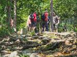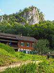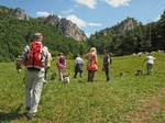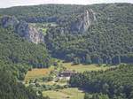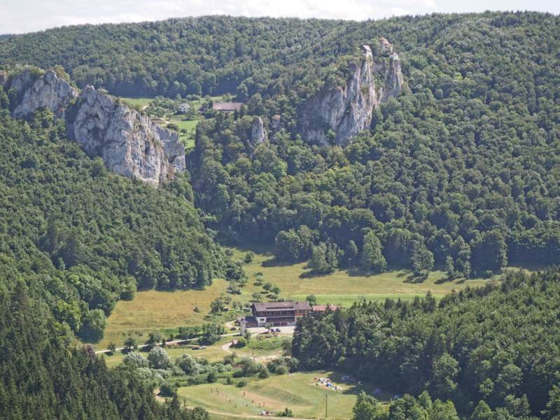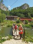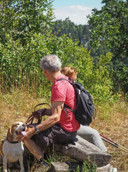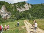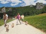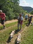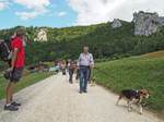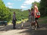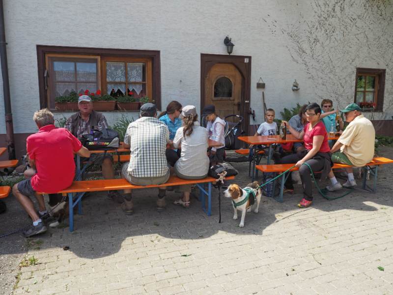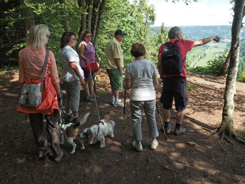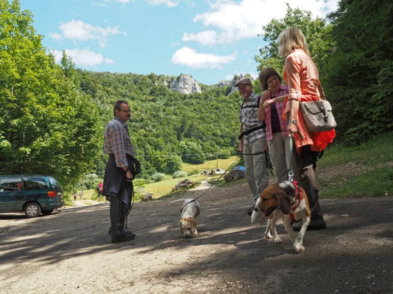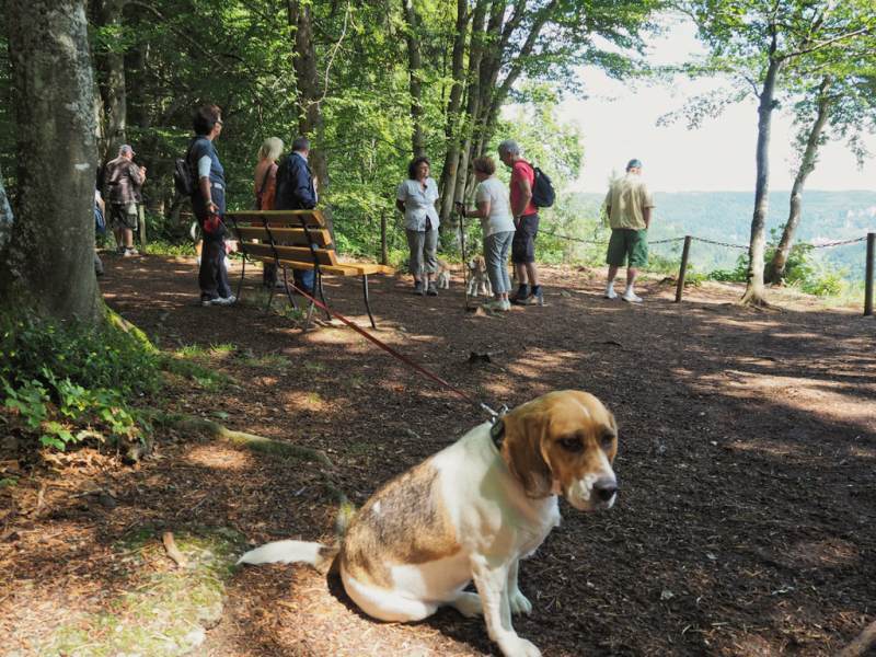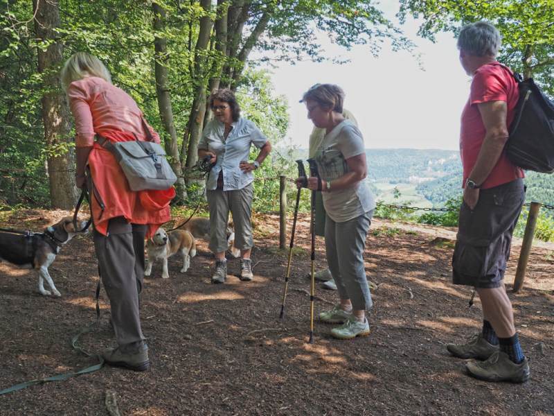Am 25.Juli 2015 trafen sich ca.25 Beagle-Leute in Fridingen in der Nähe von Tuttlingen am Knopfmacherfelsen. Eingeladen zu dieser XXL- Tour (Wanderung im Naturschutzgebiet Oberes Donautal) hatte Renate Zeiss und Wanderführer Werner Unmuth. Zuerst bestaunten wir die grandiose Sicht von der Aussichtsplattform des Knopfmacherfelsen, wo wir in östlicher Richtung über das Donautal Kloster Beuron ausmachen konnten. Im Süden sahen wir hinunter auf das Jägerhaus , und darüber wachte die Burg Bronnen auf steilem Felsen. Nach ungefähr einer ¾ Stunde erreichten wir das Jägerhaus (Höhenunterschied 150m) Dazu mussten wir kurz vor dem Jägerhaus die Donau überqueren. Weiter ging es entlang der Donau in westlicher Richtung vorbei an saftigen Donauwiesen wie auch unter schattenspendenden Waldbäumen. Des Weges entlang kamen wir an der ehem. Bronner Mühle, Bettlemannsfels, und Scheuerlehof vorbei . Im Hintergrund erschien der Stiegelesfels immer mächtiger, je näher wir zur Ziegelhütte kamen. Dort machten wir unsere verdiente Zwischenpause. Ein herrlicher Blick wurde uns während der Rast auf den Laibfelsen gegönnt. Nun überquerten wir wieder die Donau und wanderten teilweise auf dem Donauberglandweg vorbei am Kirchberg zurück zum Knopfmacherfelsen. Im Berghaus Knopfmacher wartete auf uns das verdiente Abendessen. Immer im Blickfeld das wundervolle Panorama durch die Fenster des Berghauses, hinüber über das Donautal auf die Felsenburg Bronnen, die den Talsaum dominierte. Gute Gespräche der Teilnehmer und müde zufriedene Hunde rundeten diesen erlebnisreichen Beagletag ab.