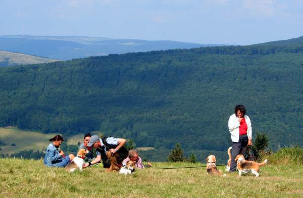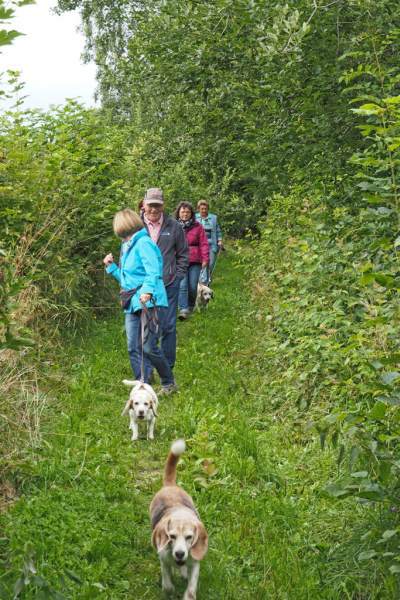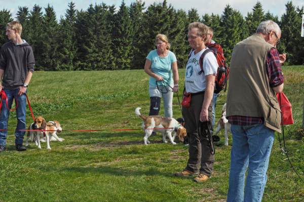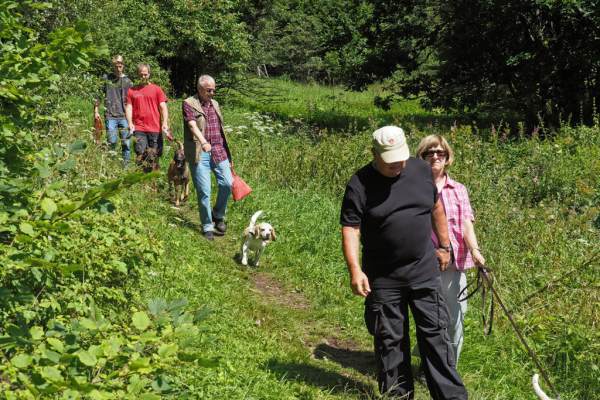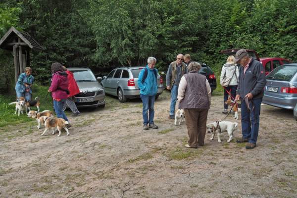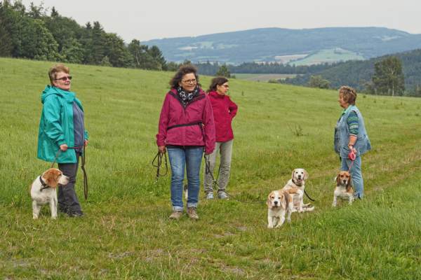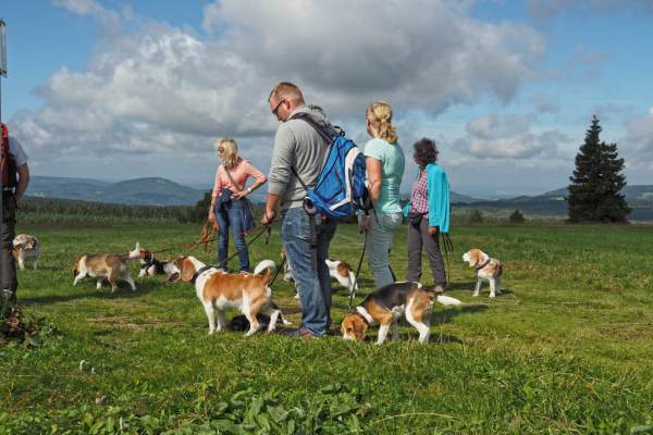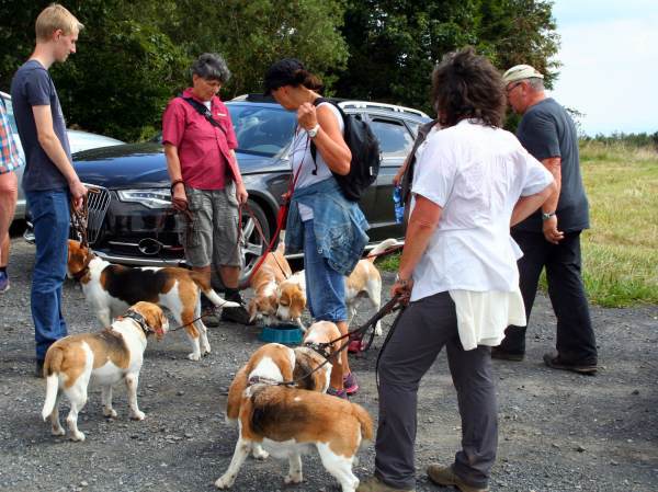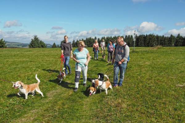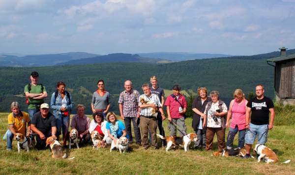 Über 20 Teilnehmer waren der Einladung von unserer Vorsitzenden Renate Zeiss zum Beaglewochenende 11. bis 15. August 2016 in die Rhön gefolgt. LG- Mitglieder aus Illertissen und Wolfsburg komplettierten die Runde, wie auch Beaglefreunde aus der Rhön. Treffpunkt und Ausgangspunkt für die Wanderungen war das Hotel Milseburg bei Hilders. Am Anreisetag war zum Einstieg ein zwei stündiger Spaziergang in der Nähe des Hotels zu absolvieren. Der zweite Tag begann am Schweinfurter Haus. Hinauf auf den Gangolfsberg der Teil der Kernzone des Biosphärenreservates Rhön ist. Hier konnten wir die bekannten Basaltsäulen und Prismenwände bestaunen. Auf der Thüringer Hütte angekommen durften wir sehr leckere Windbeutel mit Eis verkosten, und weiter ging es an der Rother Kuppe vorbei und zurück zum Schweinfurter Haus, das kulinarisch der vorangegangenen Hütte in nichts nachstand. Wunderbare Blicke nach Süden und Osten in die Rhön rundeten diesen Tag ab. Der dritte Tag begann am Parkplatz Rotes Moor hinauf auf den im bayerischen Teil der Rhön gelegenen Heidelstein, der uns einen imposanten Rundblick, wie Wasserkuppe und Kreuzberg , verschaffte. Vorbei an Schloß Holzberghof zum idyllischen Rothsee, wo wir uns eine verdiente Mittagspause gönnten. Auf dem Rückweg noch ein kurzer Stopp bei Schloß Holzberghof und zurück zum Ausgangspunkt. Das Finale dieses Tages fand in Poppenhausen auf einem Biohof im Indianerzelt statt. Hier gab es Wildschwein gefüllt mit Kräutern, dazu Semmelknödel und Rotkraut. Auf der Kissinger Hütte waren wir am vierten Tag. Eine leichte Wanderung vom Parkplatz aus auf die Hütte und wieder zurück, geschuldet unseren älteren Beagles, die tags zuvor sehr großen Einsatzwillen gezeigt hatten. Auch hier wurden wir essenstechnisch sehr verwöhnt .