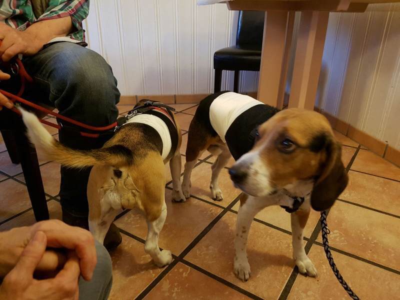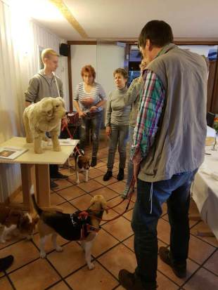 Unsere Frauchen und Herrchen setzten sich nun an die Tische, wir Beagle suchten uns einen Platz darunter. Die Dame erklärte, was unsere Herrchen und Frauchen tun müssen, wenn es uns nicht gut geht. Unsere Besitzer hörten aufmerksam zu.