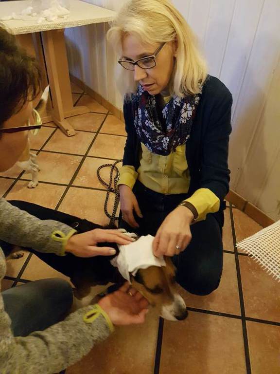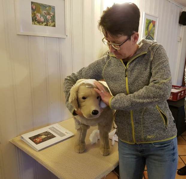 Anschließend ging es dann weiter mit dem praktischen Teil. Dieser befasste sich mit Verletzungen und deren Erstversorgung. Wieder kamen unsere Hunde zum Einsatz. Gutmütig wie sie nun einmal sind ließen sie sich die folgenden Prozeduren wie das Verbinden einer Pfote, einen Druckverband anlegen, sowie das Verbinden einer Verletzung am Ohr ohne Gegenwehr gefallen.