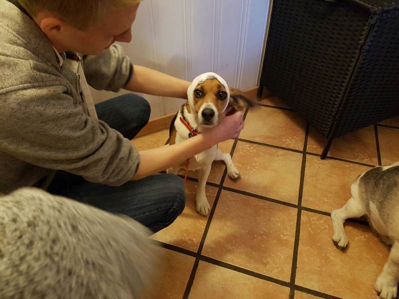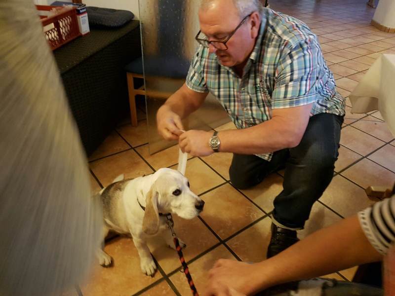 Nun wurde das Ganze noch spannender, es folgte nämlich der Praxisteil, wo wir aktiv mitwirken sollten. Unsere Herrchen und Frauchen mussten uns nämlich Verbände anlegen. Zuerst kam die Pfote dran. Sie machten das ganz gut. Da wir gut sozialisierte und wohl erzogene Hund sind, hielten wir nämlich still. Dann folgte ein Druckverband an unserem Körper. Am lustigsten war jedoch für unsere Herrchen und Frauchen wohl der Ohrenverband. Die hatten Glück, dass wir so schöne Schlappohren haben, die lassen sich nämlich recht gut verbinden. (Macht das mal beim Schäferhund!) Nach dieser Aktion sahen wir allerdings recht bedröppelt aus. So sorgten wir auch noch für Bespaßung. Damit ihr auch einen Eindruck habt, anbei die Bilder.