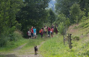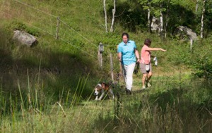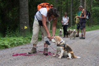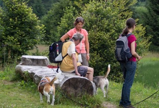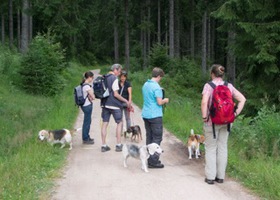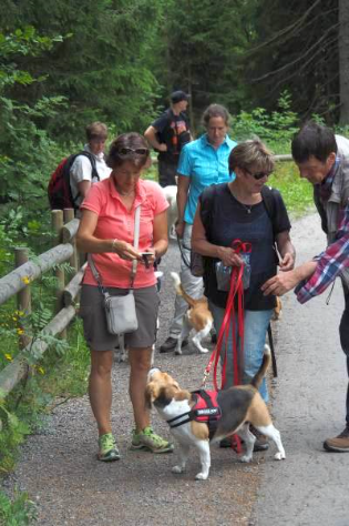 Bei sommerlichen Temperaturen startete die Gruppe zunächst bergan Richtung Feldsee. Unterwegs konnten die ersten Beagles mit ihren Hundeführern ihr Können unter Beweis stellen, und wie erwartet verfolgten Lola und Barkley souverän die ausgelegten Spuren in der freien Natur. Danach zeigten auch Nelson und Cassy, dass sie den anspruchsvollen Split-Trails in ablenkungsreicher Umgebung durchaus gewachsen waren. Vollen Arbeitseifer demonstrierten dann auch die übrigen Hunde, während wir gleichzeitig die schöne Natur im Feldberggebiet genießen konnten. Nach ca. 3 stündiger Wanderung steuerten wir dann zur wohlverdienten Rast eine nahegelegene Berghütte an, in der wir den nun einsetzenden Gewitterschauer im gemütlichen Stübchen in aller Ruhe abwarten konnten. Der Rückweg gestaltete sich wieder trocken und entspannt bergab und wir nutzten die verbliebene Zeit um noch das „Anzeigen“ an der Person zu üben.