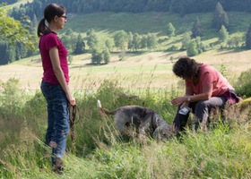 Am Sonntagmorgen mussten wir unser Hotel leider schon wieder verlassen. Den letzten Trainingstag wollten wir noch auf der Menzenschwander Alb verbringen und legten unsere Fährten zwischen malerischen Schwarzwaldhöfen und ausgedehnten Weideflächen entlang einzelner Etappen des Premiumwanderweges in diesem idyllischen Hochtal. Bei der Mittagseinkehr im „Kuckuck“ waren wir dann dank des herrlichen Sommerwetters auch bei weitem nicht die einzigen Gäste. Gestärkt und ausgeruht nahmen wir nach der Rast noch ein paar Anzeigeübungen in Angriff. Nach dem ausgefüllten Vormittag wollten wir es nun etwas ruhiger angehen lassen, aber Bumble Bee zeigte uns deutlich, dass sie sich mit ihren knapp 14 Jahren noch ganz schön ins Zeug legen kann und forderte deutlich ihre wohlverdiente Belohnung ein. Zwei Stunden später waren dann doch alle ziemlich geschafft und gegen Abend traten wir nach einem arbeitsreichen Wochenende die Heimreise an.