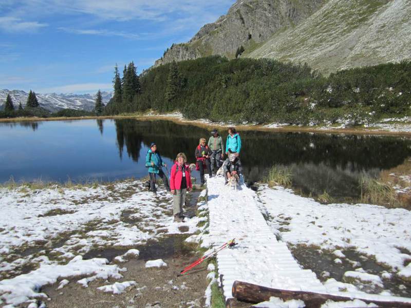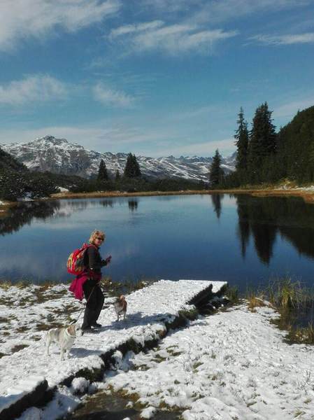 Freitag, 15.09.2017, 10:00 Uhr Start zu Fuß zur ca. 300 Meter entfernten Talstation der Tafamuntbahn. Die Fahrt dauerte nur einige Minuten. Angekommen an der Mittelstation wurden wir schon von einer gemütlichen Berghütte dem Alpstöbli Tafamunt empfangen. Von hier aus begab man sich dann zum Wiegensee. Dies verlangte zuerst einen 60 Minuten langen Aufstieg begleitet von idyllischen Bächlein, was für die Hunde natürlich super war. Nach diesem anstrengenden Anstieg durchliefen wir eine wunderschöne Moorlandschaft und erreichten den Wiegensee nach weiteren 40 Minuten. Der kleine Bergsee und die Ruhe in der Natur verzauberten uns und hier konnten wir erst einmal durchatmen. Die Pause gab uns wieder Mut und Kraft, uns auf den Weg zur Verbellaalpe auf einem herrlichen Bergpfad zwischen Steinen und Bächlein maschieren zu lassen. Nach einer weiteren Stunde waren wir schon leicht erschöpft an der Hütte angekommen und erfreuten uns an der Bewirtung des Hüttenbesitzers Verbellaalpe.