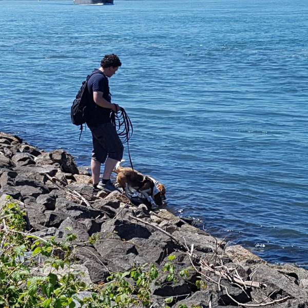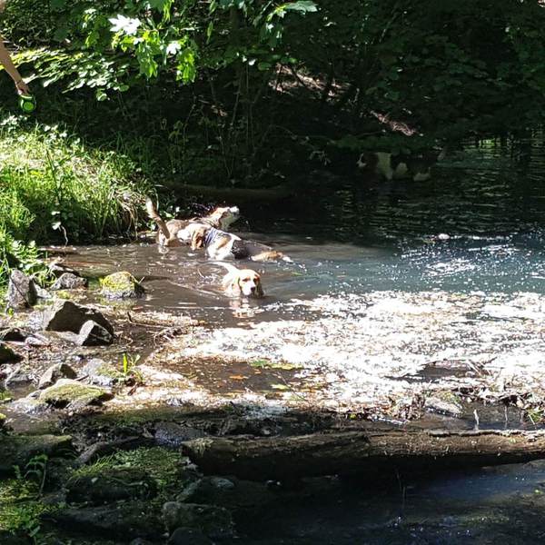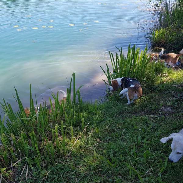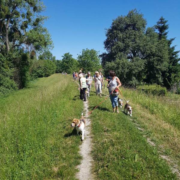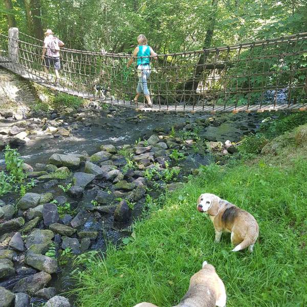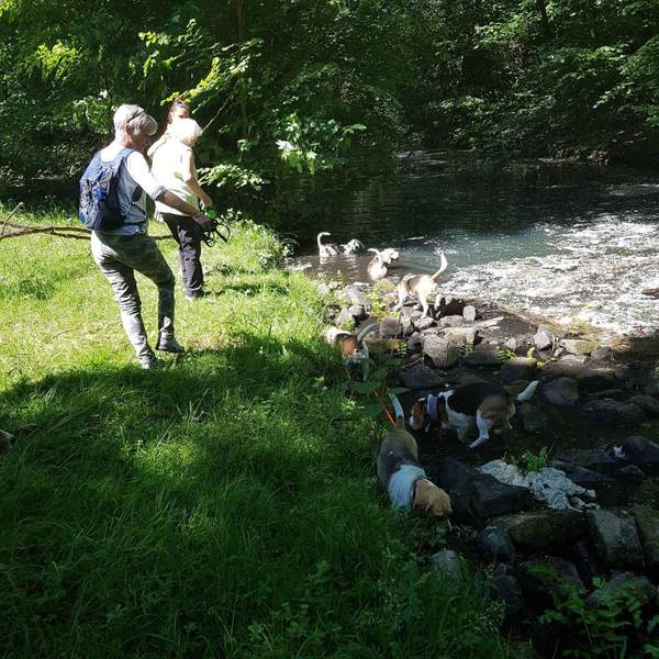Der Weg führte durch die Rheinauen, vorbei an romantischen Seen und Bächen um letztlich zum" Vater Rhein" zu gelangen. Doch bis es soweit war, musste die Truppe eine wackelige Hängebrücke überwinden. Hier wurde der Bindung/ Vertrauen" Hund und Führer" einiges abverlangt und kostete bei dem ein oder anderen Beagle die ganze Überzeugungskraft von Herrchen oder Frauchen.