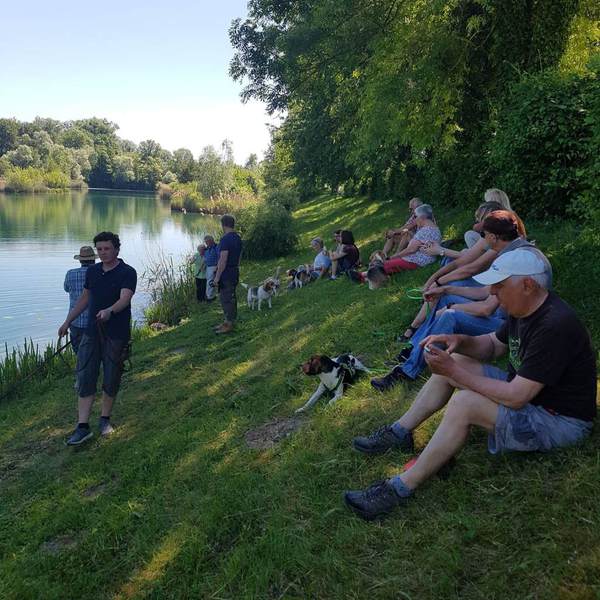 An der Riedhütte mit anliegendem Weiher legte der Trupp ein Päuschen im Schatten ein. Einige Hunde verschafften sich im