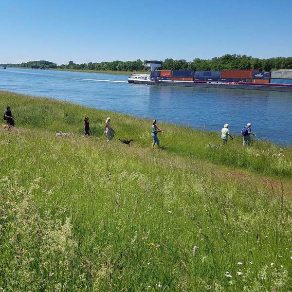 Anschließend wanderten wir vom Wald heraus auf freie Acker- und Wiesenlandschaften und gelangten schließlich an den Rhein. Der Rhein in seiner ganzen Breite, im Hintergrund das angrenzende Elsass, sowie einem vorbeifahrenden Kahn und kleinen Sportbooten zur Ansicht, spazierten wir bei inzwischen hochsommerlichen Temperaturen den Rheindamm entlang. Dann verließen wir den Rheindamm wieder und machten wir uns auf den Rückweg, der uns idealerweise durch immer wieder schattige Stellen, zum Ausgangspunkt führte.