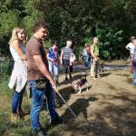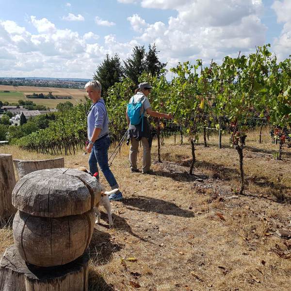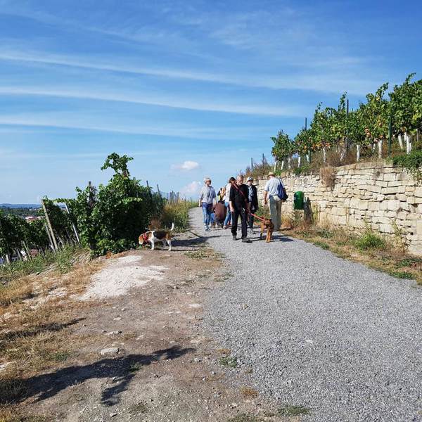 Anschließend ging es entlang an Winzeranbauhängen, den vorderen Berg und hinteren Berg, zu den Schöckinger Weinbergen. Der Weg führte kurz entlang der Schöckinger Äcker zu den Zimmerwiesen. Die Steigungen hielten sich in Grenzen, so dass für alle der Weg zu keinen größeren Anstrengungen führte und der Trupp gut vorankam. Trotzdem wurden immer wieder kurze Verschnaufpausen sowohl für den Mensch und die Vierbeiner eingelegt.