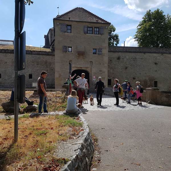 Der Einladung von Familie Nordmann zur Beaglewanderung am Sonntag, den 26.08. 2018 folgten 24 Zweibeiner mit 14 Beagle sowie drei non Beagle. Wir trafen uns bei idealen Wetterbedingungen auf dem Parkplatz vor der Burg Hohenasperg. Allein die Auffahrt durch das Löwentor zur Burg war bereits vielversprechend.