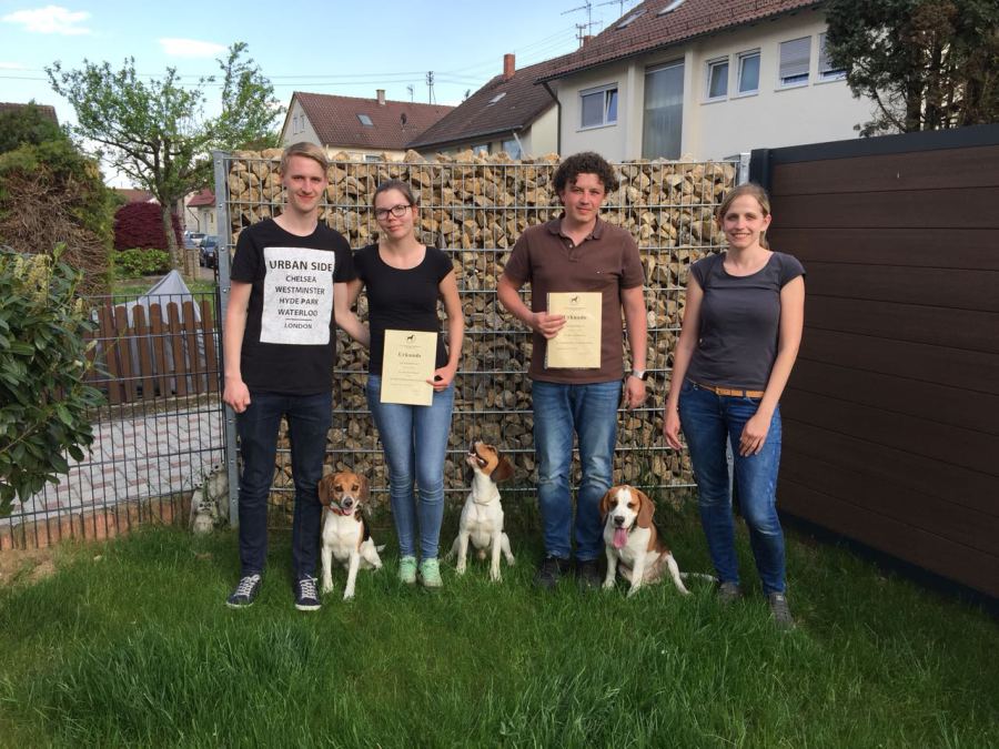 Am vergangenen Sonntag, dem 29. April 2018, war es so weit. Lou und Sam hatten ihren großen Tag, es war der Tag der Begleithundeprüfung. Über ein halbes Jahr haben Denis und Elisa, manchmal zum Unmut ihrer beiden Beaglerüden Lou und Sam, auf diesen Tag hin trainiert. Unzählige Trainingsstunden und viele hundert Leckerchen lagen hinter den Beiden, sodass sie eigentlich perfekt für diesen Prüfungstag vorbereitet sein sollten. Trotzdem war die Aufregung, verständlicherweise, bereits Wochen vor der Prüfung sehr groß. Die letzten Tage wurde nochmals jede freie Minute für jegliche Art Training genutzt, insbesondere für die "Ablage", keine einfache Aufgabe für die beiden energiegeladenen Rüden.