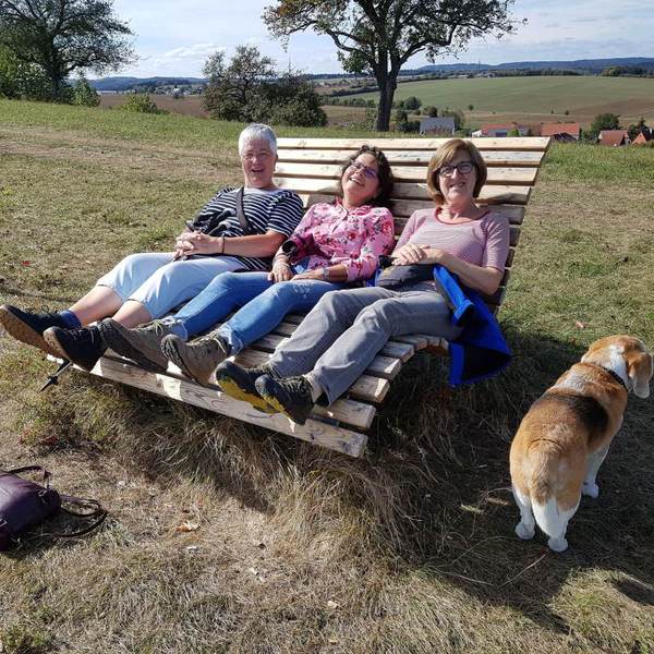 Aufgrund des schönen Wetters konnten alle Beteiligten die herrlichen Aus- und Weitblicke genießen. Ab und zu legten wir eine kleine Verschnaufpause ein. So gab es auch Gelegenheit ein Gruppenfoto zu machen. Die Personengruppe ist leider nicht vollzählig, da sich drei Damen nicht von einer durchaus bequemen Holzliegebank und der wärmenden Sonne lösen konnten.