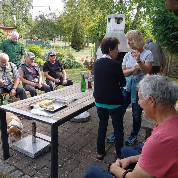 Nach kurzem Telefonat stelle sich heraus, dass er den Anschluss an einer Kreuzung verpasst hatte und in der Ortschaft wartete. Die ortskundige Marion führte Reinhard zum "Rudel" zurück und so konnte dieser, noch bevor das leckere Essen aufgetragen wurde, wieder unter uns weilen. Die Vollzähligkeit des "Rudels" sollte wohl nach der Wanderung ebenfalls nochmals überprüft werden :)