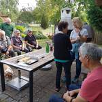 Auf dem Rückweg kam es zu einer angenehmen Unterbrechung. Am Ortsrand, standen freundliche Personen die uns mit einem überraschenden "Bitte hier entlang" auf ein Gartengrundstück leiteten. Hier stand ein schönes Gartenhäuschen sowie Sitzgelegenheiten und ein liebevoll gerichteter Tisch. Darauf befanden sich verschiedenen Flaschen mit selbstgemachten Leckereien, die Etiketten ließen den Inhalt erahnen. Früchte und Nüsse verflüssigt und mit Alkohol versetzt wurden uns zur Verkostung angeboten. Auch ein sehr leckerer Apfelstreuselkuchen und Nüsse in ihrer Ursprungsform konnten gekostet werden.
