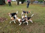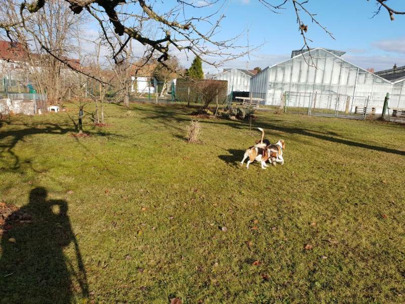 Nachdem mit mehr oder weniger deutlichen Hinweisen die Besitzverhältnisse, der auf dem Tisch befindlichen Leckereien geklärt war, nutzten die Beagle die seltene Gelegenheit im Verbund umherzuspringen und ihre Bewegungsfreiheit in vollen Zügen zu genießen. So ein eingezäunter Garten ist doch was Tolles.