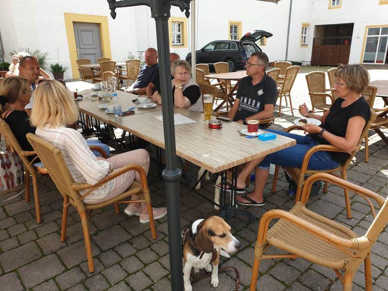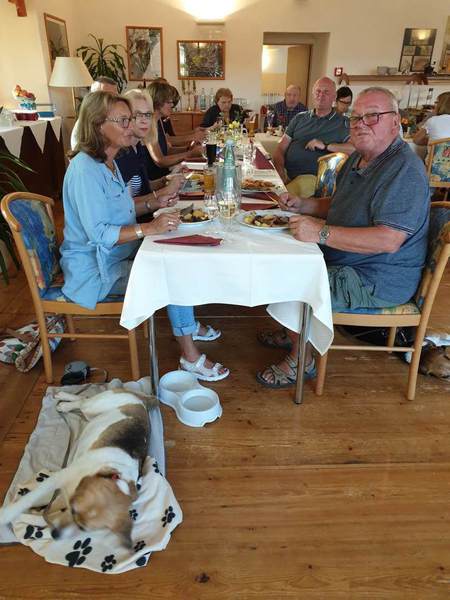 Später traf man sich dann zum gemeinsamen Abendessen im Speissaal, wo auch die Vierbeiner willkommen waren. Anschließend wurde der Abend beim gemütlichen Zusammensitzen im Schlosshof beendet.