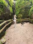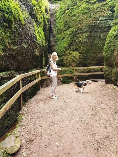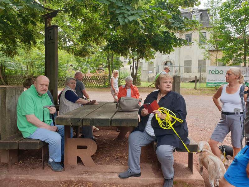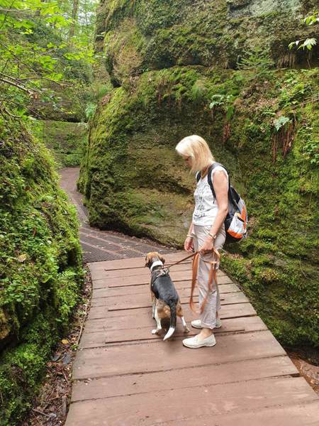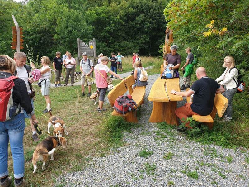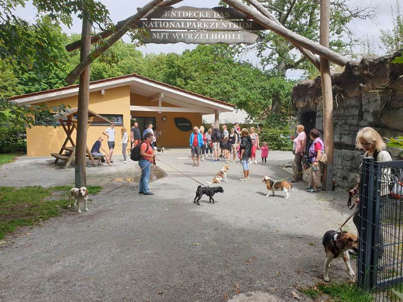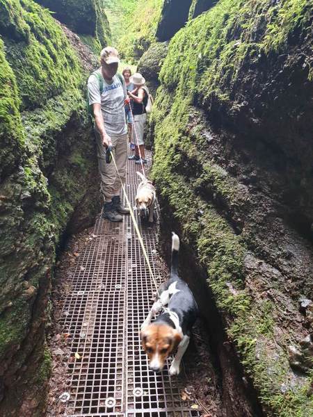 Am Freitag, den 09.08.2091 war eine Wanderung in die Drachenschlucht bei Eisenach geplant. Nach einem reichhaltigen Frühstücksbuffet traf man sich um 10.00 Uhr zur Abfahrt. Wir erhielten Verstärkung von der Thüringer Beaglegruppe, so dass wir mit 21 Personen und 15 Vierbeinern sowie unserer ortskundigen Wanderführerin, Frau Karin Jung, starteten. Am Zielort angekommen, gab es von Karin Jung eine kurze Einführung über die Gegebenheiten in der Schlucht.
