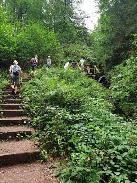 Die Route führte zunächst entlang dem Mariental über Waldwege bis zum Einstieg in die Drachenschlucht. Hier hat die Natur eine großartige Szenerie erschaffen. Der Höhepunkt des Naturschauspiels ist eine 182 m lange Klamm, die zum Teil nur 70 cm breit ist. Seit 1832 kann man die Schlucht auf einem Bohlenweg über dem gurgelnden Marienbach und zwischen 10 Meter hohen mit Moos bedeckten Felswänden durchwandern. Aufgrund seiner "Breite" konnte der Weg nur im Gänsemarsch absolviert werden. Bei der Luftfeuchtigkeit in der Schlucht fühlt man sich fast wie im tropischen Regenwald.