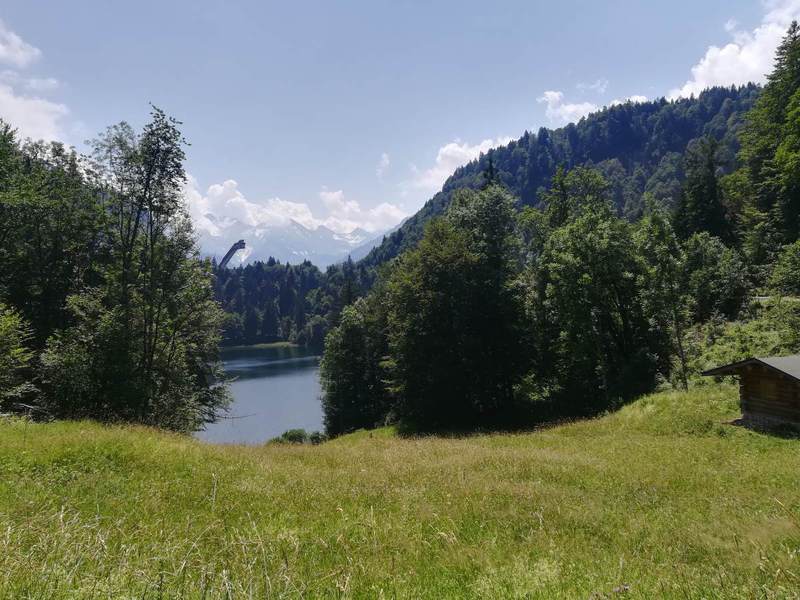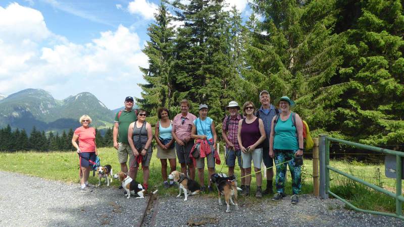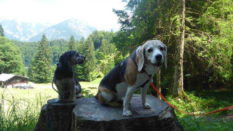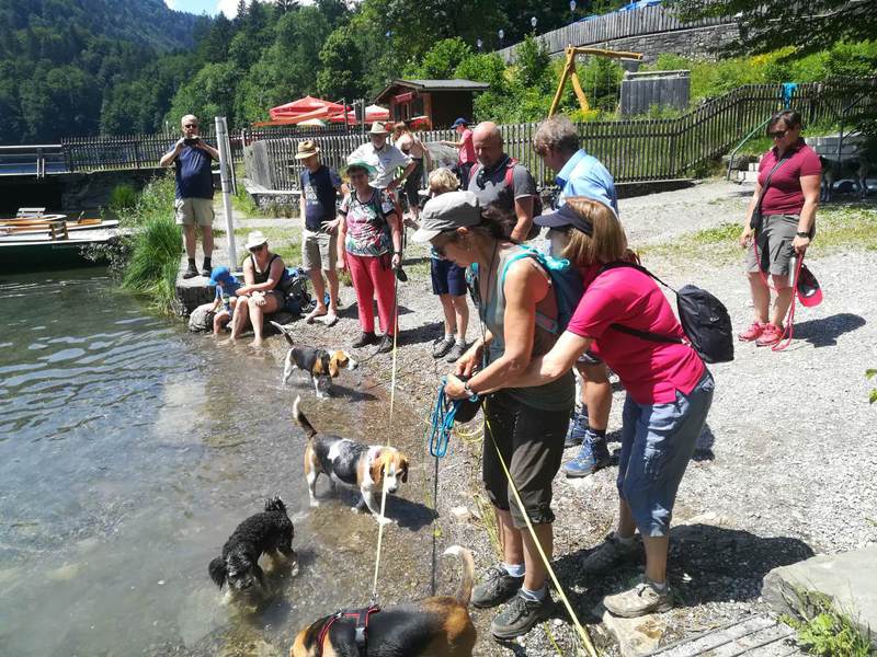 Fast pünktlich trafen wir uns am Donnerstag, 4. Juli 2019, auf dem Parkplatz Höllwieslift in Oberstdorf. Mit dabei waren 10 Personen mit ihren 6 Hunden. Bei sonnigen 28 Grad wanderten wir die Stillach entlang. Nun folgte der sportliche Teil unserer Wanderung. Auf einem Kiesweg ging es relativ steil bergauf und erreichten über den Dr.-Reh-Weg die Heini-Klopfer-Skiflugschanze. Ein Eis am Stiel motivierte uns weiterzugehen. Unsere Hunde kühlten sich im Freibergsee ab, allen voran Benny und Lotte. Auch nagte langsam der Hunger bei den Zweibeinern. Der Kiosk am See lud zur Rast ein. Ein steiler Weg abwärts führte uns wieder zum Parkplatz. Nun steuerten wir unser Hotel in der Spielmannsau an. Wir wurden herzlich von Frau Schraudolf empfangen. Ein Mittagsschläfchen machte uns für den Abend wieder fit. Unser Abendessen nahmen wir auf Terrasse ein, doch mussten wir uns warm anziehen. Frisch gestärkt brachen wir zum Abendspaziergang auf. Ein kleiner zutraulicher Hase war ein mutiges Tier, die Beagle fürchteten sich vor ihm. Bei einem Glas Rotwein ging der Abend zu Ende.