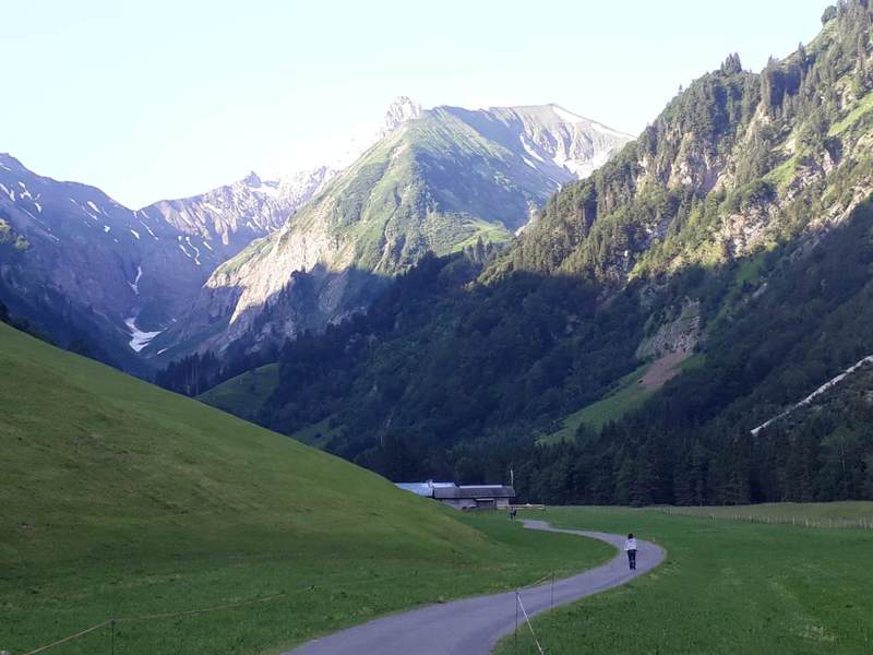 Am Samstag fuhren wir nach einem reichhaltigen Frühstück mit unseren Autos zur Talstation der Söllereckbahn. Die Gondel brachte uns hinauf zur Bergstation. Wir wanderten mit einem wunderschönen Blick auf das Kleinwalsertal. In der Mittelalpe löschten wir unseren Durst mit Heidelbeermilch, Almdudler usw. Steil hinunter führte uns der Weg nach Riezlern. Mit dem Walserbus fuhren wir nach Baad, das Ende des Kleinwalsertals. Dort kehrten wir zur Mittagsrast ein. Nun begann die zweite Wanderung des Tages. Unser Ziel war die Bärgunthütte. Unsere Hunde konnten sich bei den heißen Temperaturen im Bärguntbach erfrischen. Mit Rücksicht auf die Hunde verweilte ein Teil der Gruppe in der Widdersteinhütte. Lucy und Wilma schlugen sich mit Herrchen und Frauchen zur Bärgunthütte durch. Dort wurden wir mit einem herrlichen Blick auf den Großen Widderstein belohnt. Es waren noch einzelne Schneefelder zu sehen. Nicht Kühe, sondern Pferde kreuzten unseren Weg nach unten. Todesmutig passierten wir diese Stelle. Gemeinsam ging es zurück nach Baad, in den Bus, zur Talstation der Söllereckbahn, mit dem Auto zur Spielmannsau. Nach einer kurzen Pause ließen wir uns das Abendessen schmecken.