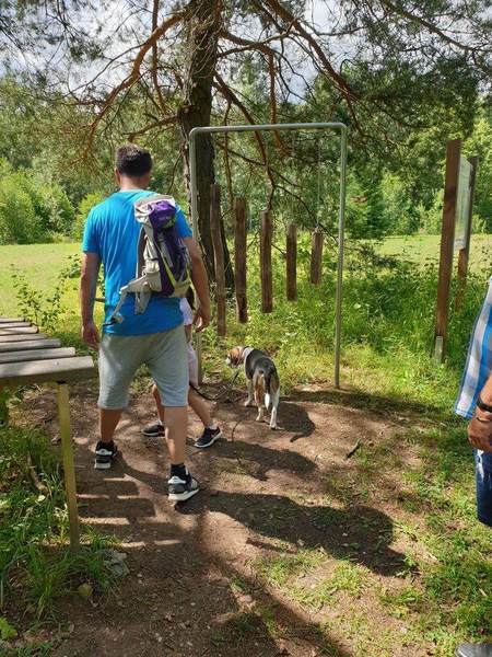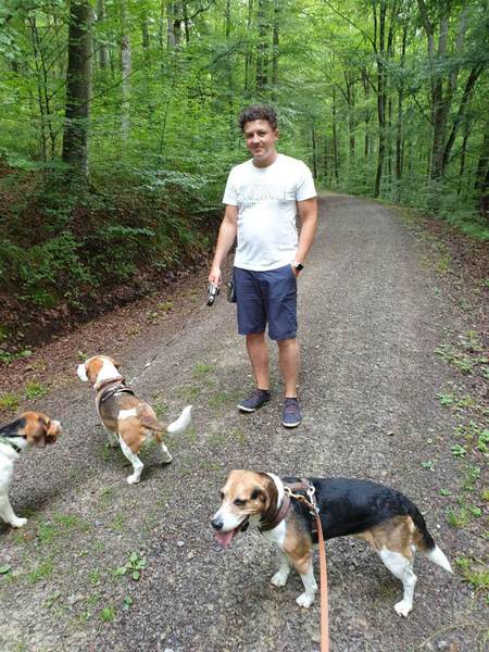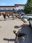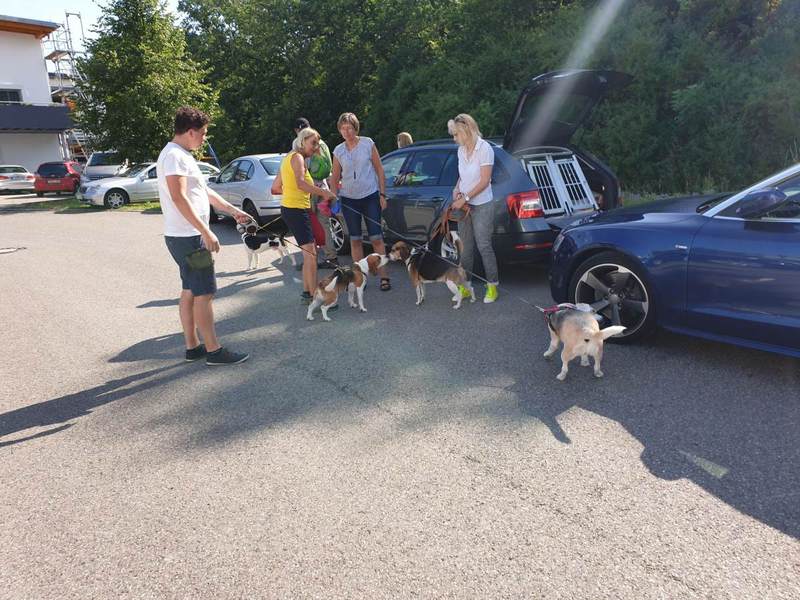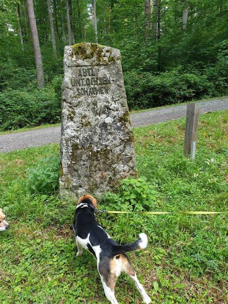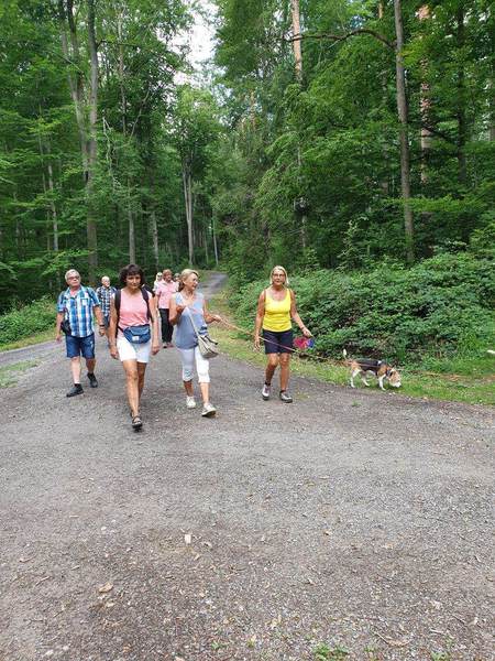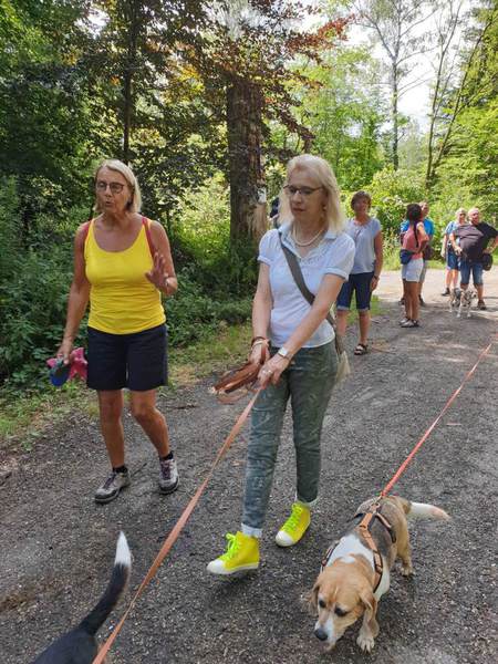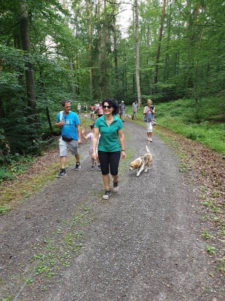 Es trafen sich 15 Wanderfreudige mit 10 Beagle Auch zwei Gastbeagle konnten wir in unserer Runde begrüßen, Hündin Clio und Rüde Theo jeweils mit Begleitung. Das Wetter war nach einem Gewitter in der vergangenen Nacht sehr angenehm, da es nicht schon morgens drückend heiß war, wie in den vergangenen Tagen. So konnten wir nach der Begrüßung durch Peter .Lämmle, dem Organisator, kurz nach 10.00 Uhr starten.
