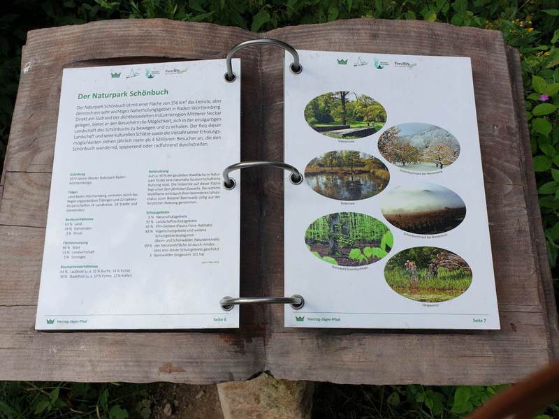 Zudem waren am Wegesrand des Lehrpfades immer wieder Hinweisschilder sowei Tafeln mit Erklärungen zum Naturpark Schönbuch in geschichtlicher (z.B. den Abbau von Stubensandstein seit 1338, - Stein der Schwäbischen Gotik-, der für den Bau des Ulmer Münster und weiteren historischen Bauten verwendet wurde), sowie naturkundlicher Art, zu finden.