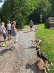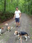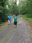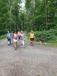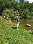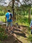 Im weiteren Verlauf führte uns der Wanderweg schließlich an einen kleinen See. Einige wasserfreudige Beagle nahmen die Gelegenheit einer willkommenen Abkühlung wahr und wagten sich ins Wasser, andere beobachteten das Treiben vom Rand sehr aufmerksam. Abgelenkt wurden sie dann, als zwei Artgenossen samt Besitzer den Weg passierten und ein Teil unserer Beagle sich wieder mal verbündete und die deutlich Stärkeren mit Gebell zu beeindrucken suchten.